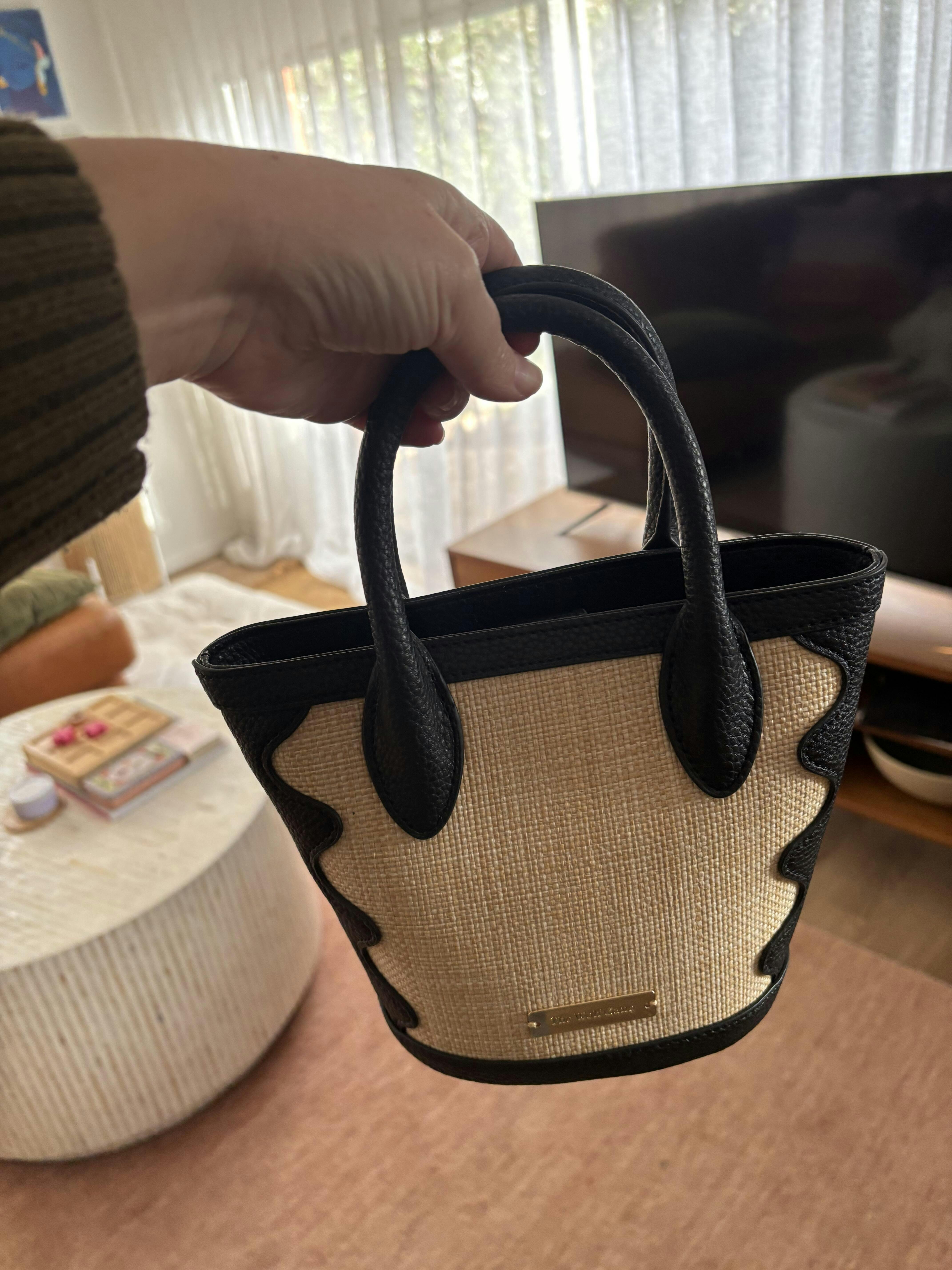 Get wavy with our Blanca Mini Bag! Crafted from raffia-look fabric with faux-leather contrast details; vegan-friendly never looked so good! Sling the Blanca crossbody for elevated everyday, or use her structured top handles for an on-trend statement.