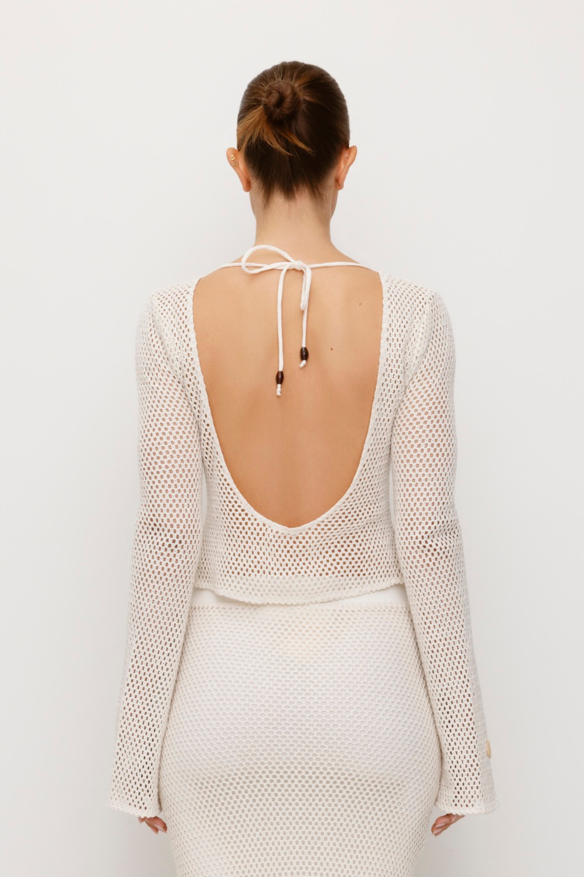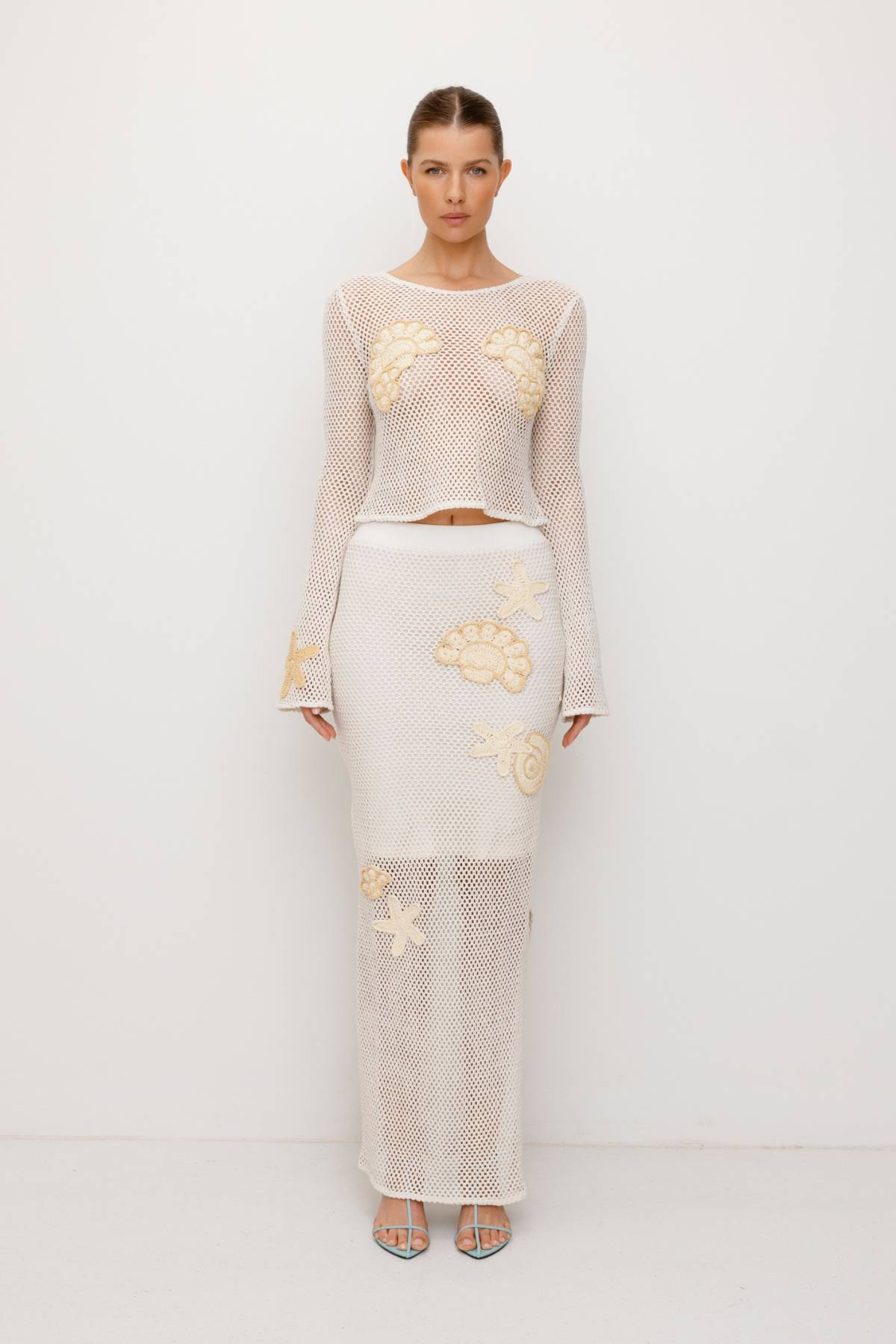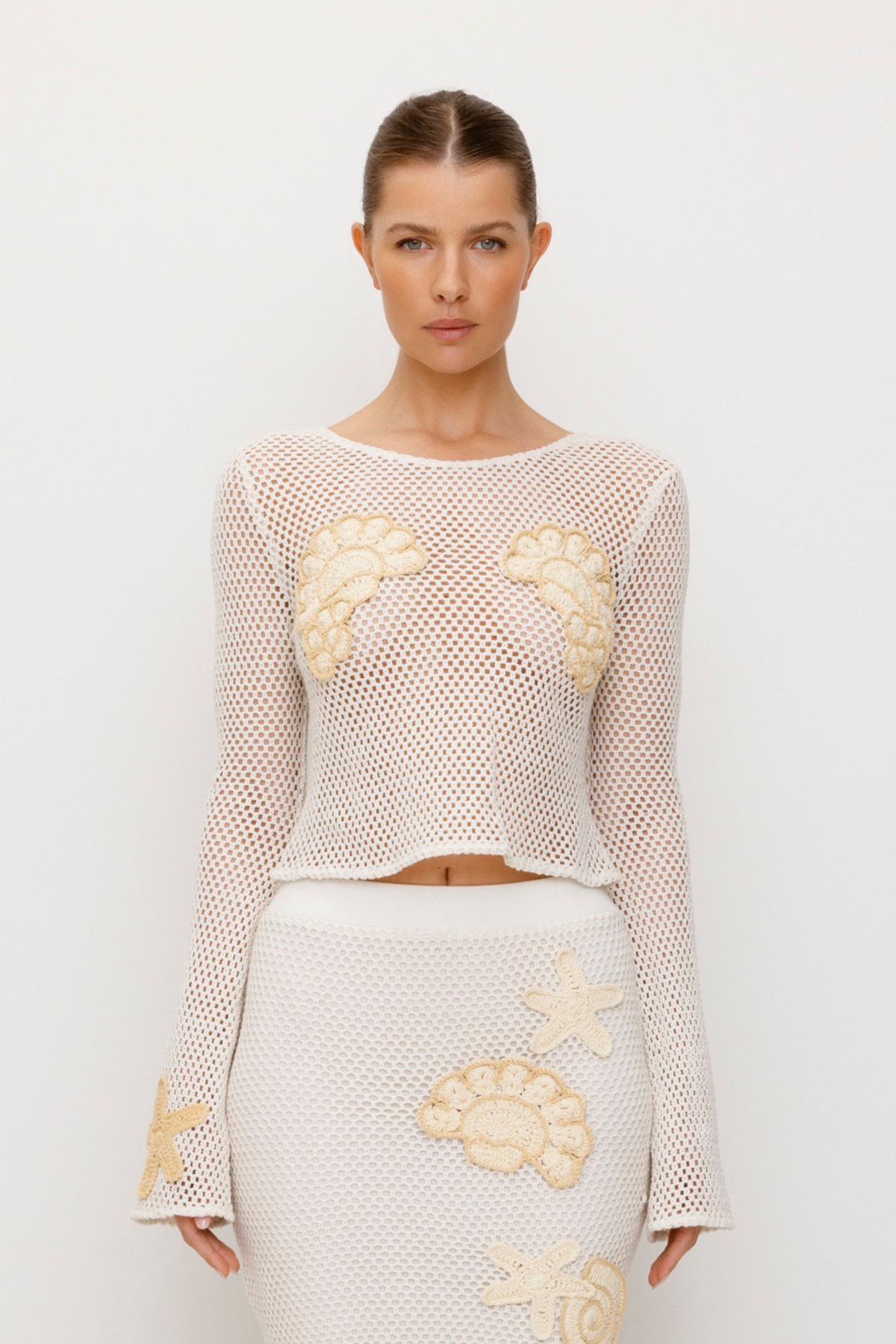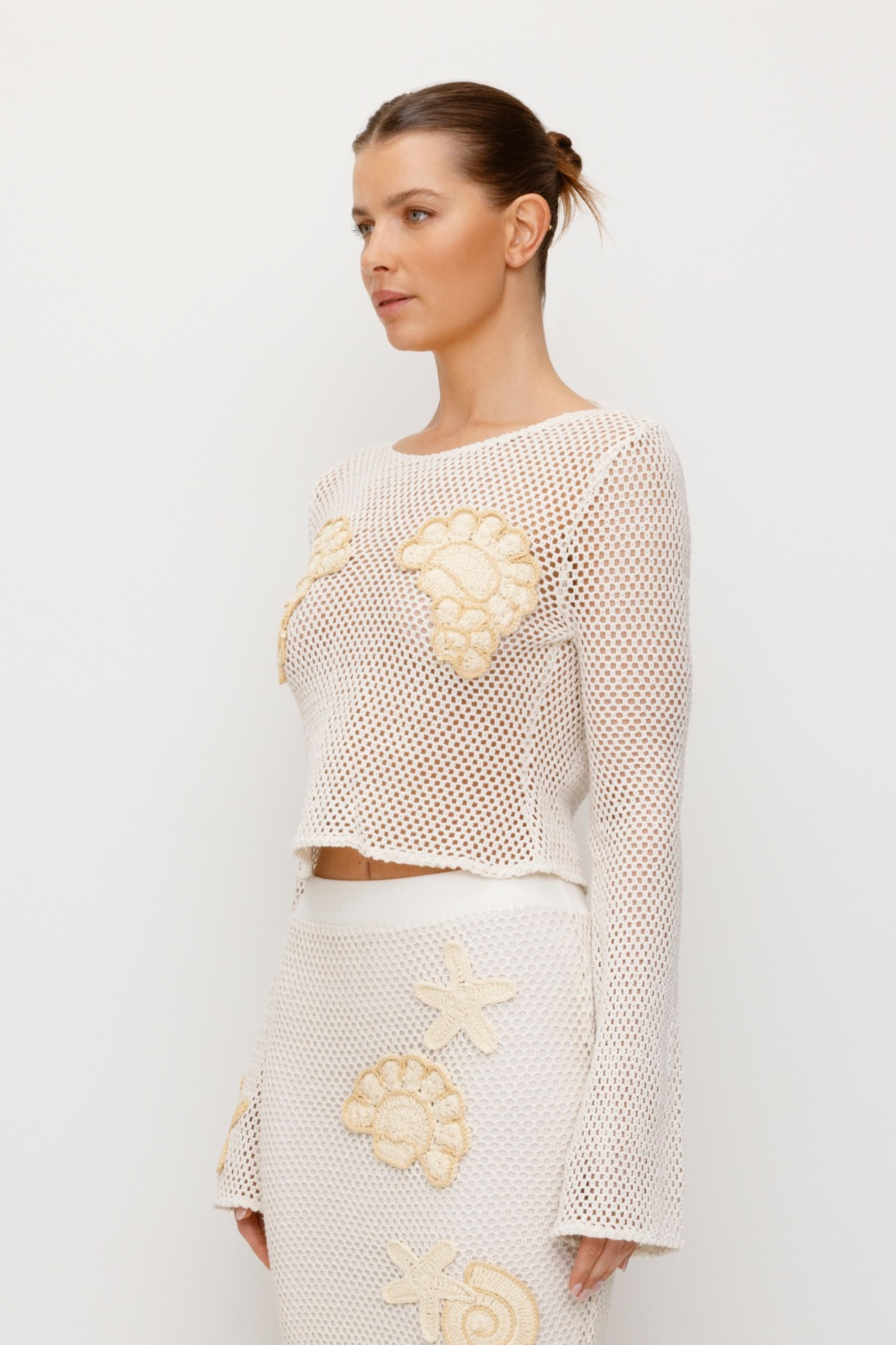 Introducing the Enza Long Sleeve Top – the perfect blend of style and comfort for your summer wardrobe. Featuring custom TWG hand-crochet shell motif embellishments, this top adds a unique, artisanal touch to your wardrobe. Pair it with the matching Enza Maxi Skirt for a coordinated look or with denim shorts for a more casual yet polished look. Whether you're dressing up or down, the Enza Long Sleeve Top is your go-to piece for a refined, relaxed summer style.