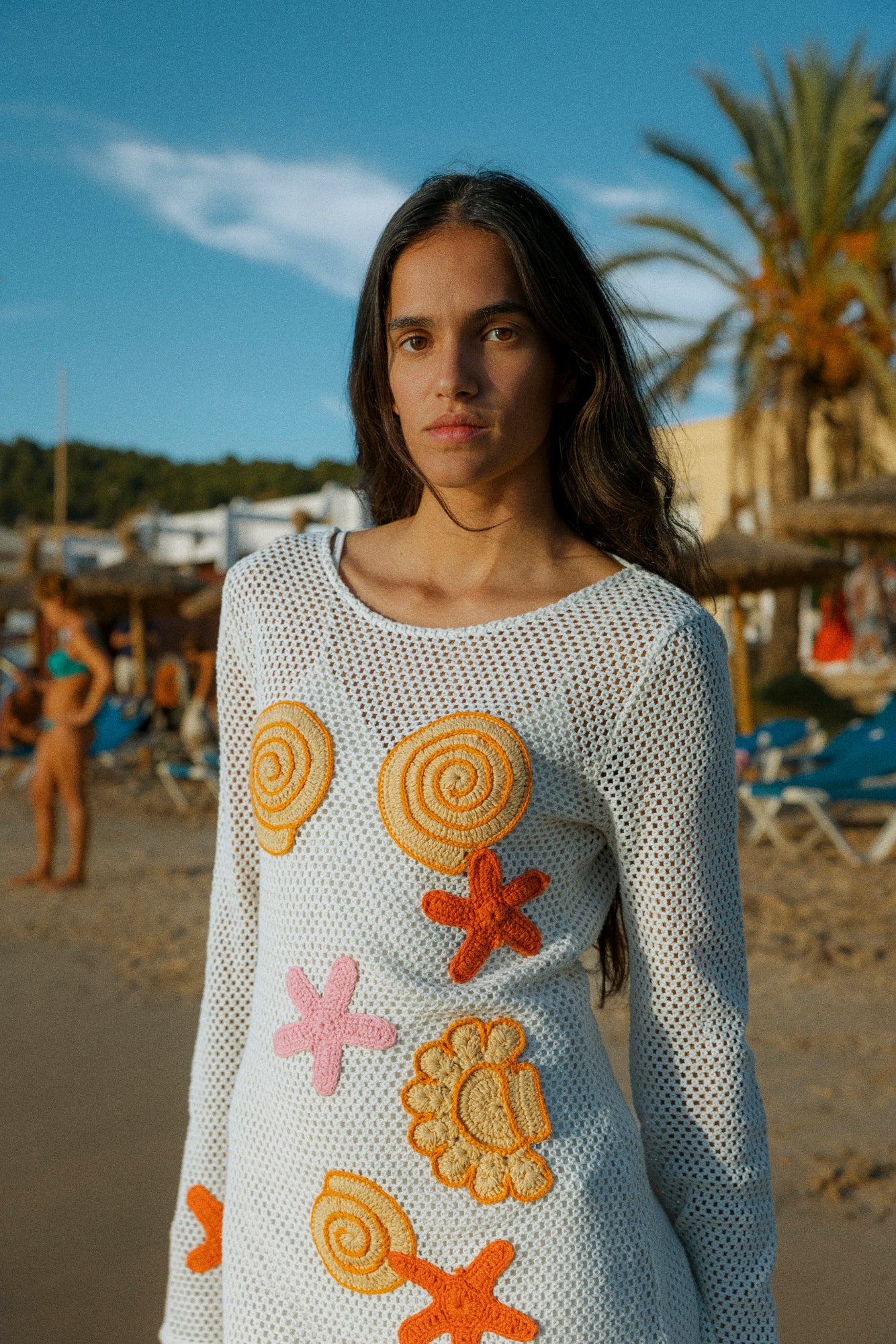 Slip into the Enza Mini Dress for an effortlessly chic summer look! This stunning piece features custom TWG sea-themed handmade crochet motifs and a detachable slip lining for added versatility. The bell-shaped long sleeves add a dramatic touch, making this dress a standout piece you'll love season after season. Pair over bathers for a cute beach cover up or with a low waisted belt and boots for the ultimate festival look.
