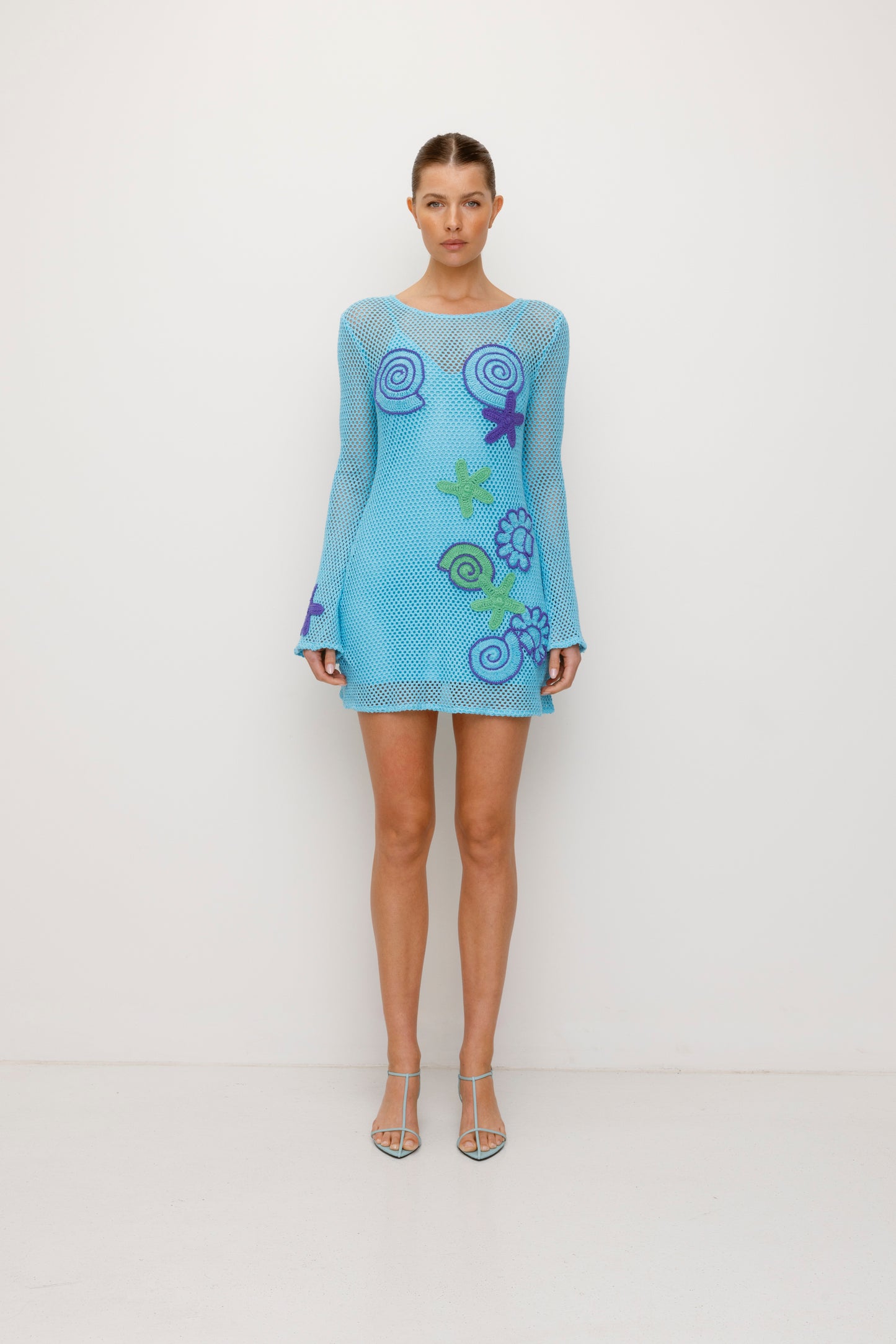 Slip into the Enza Mini Dress for an effortlessly chic summer look! This stunning piece features custom TWG sea-themed handmade crochet motifs and a detachable slip lining for added versatility. The bell-shaped long sleeves add a dramatic touch, making this dress a standout piece you'll love season after season. Pair over bathers for a cute beach cover up or with a low waisted belt and boots for the ultimate festival look.