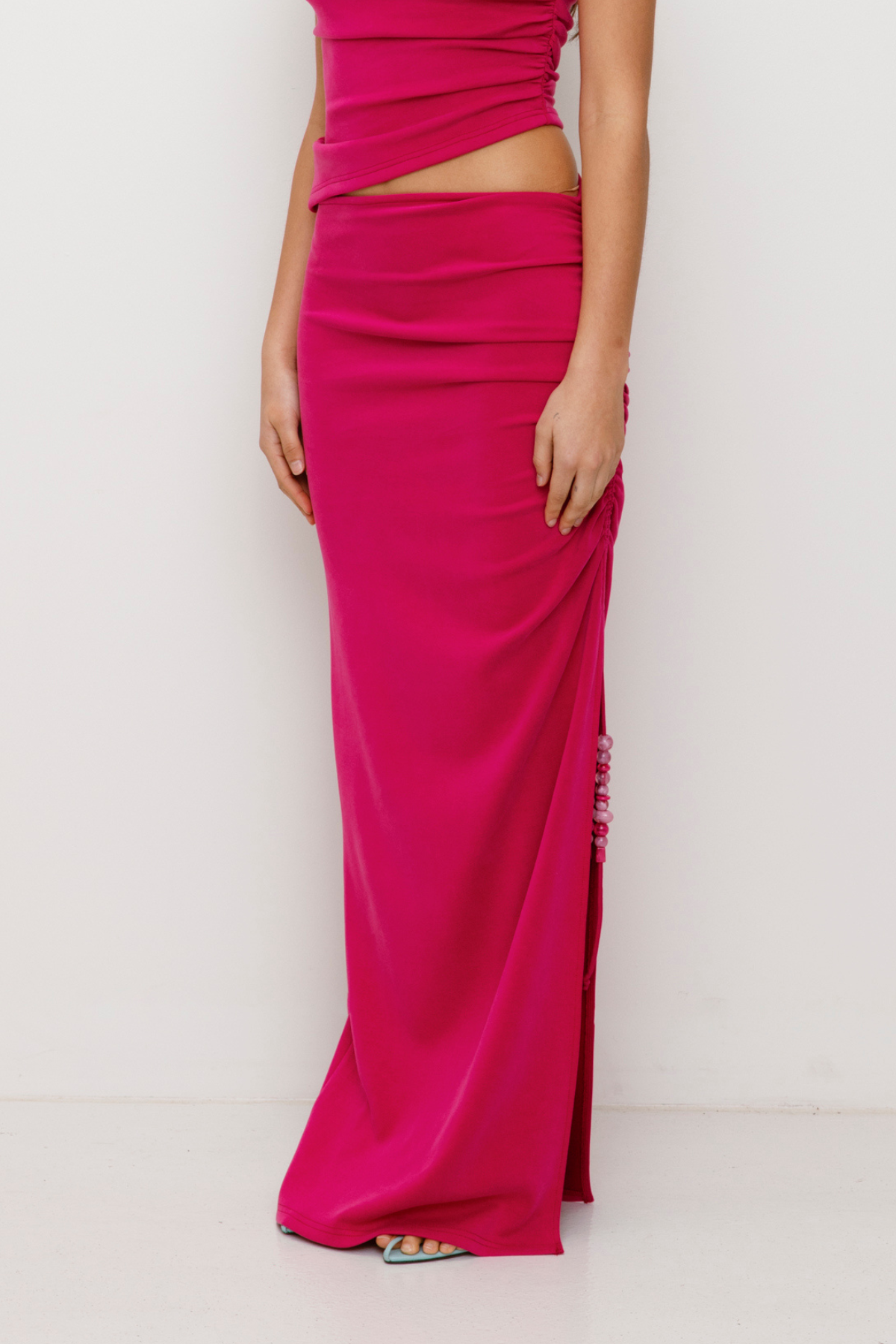 The Flor Skirt is your go-to for effortless statement dressing. Cut from our signature buttery jersey, it skims the body with a soft, fluid drape and features delicate side ruching to flatter the form. A beaded trim adds a touch of texture and shine, bringing a subtle edge to its sleek silhouette. Wear it with the matching Flor Top for a coordinated look or pair it back with a simple tee for a more laid-back take on event styling.