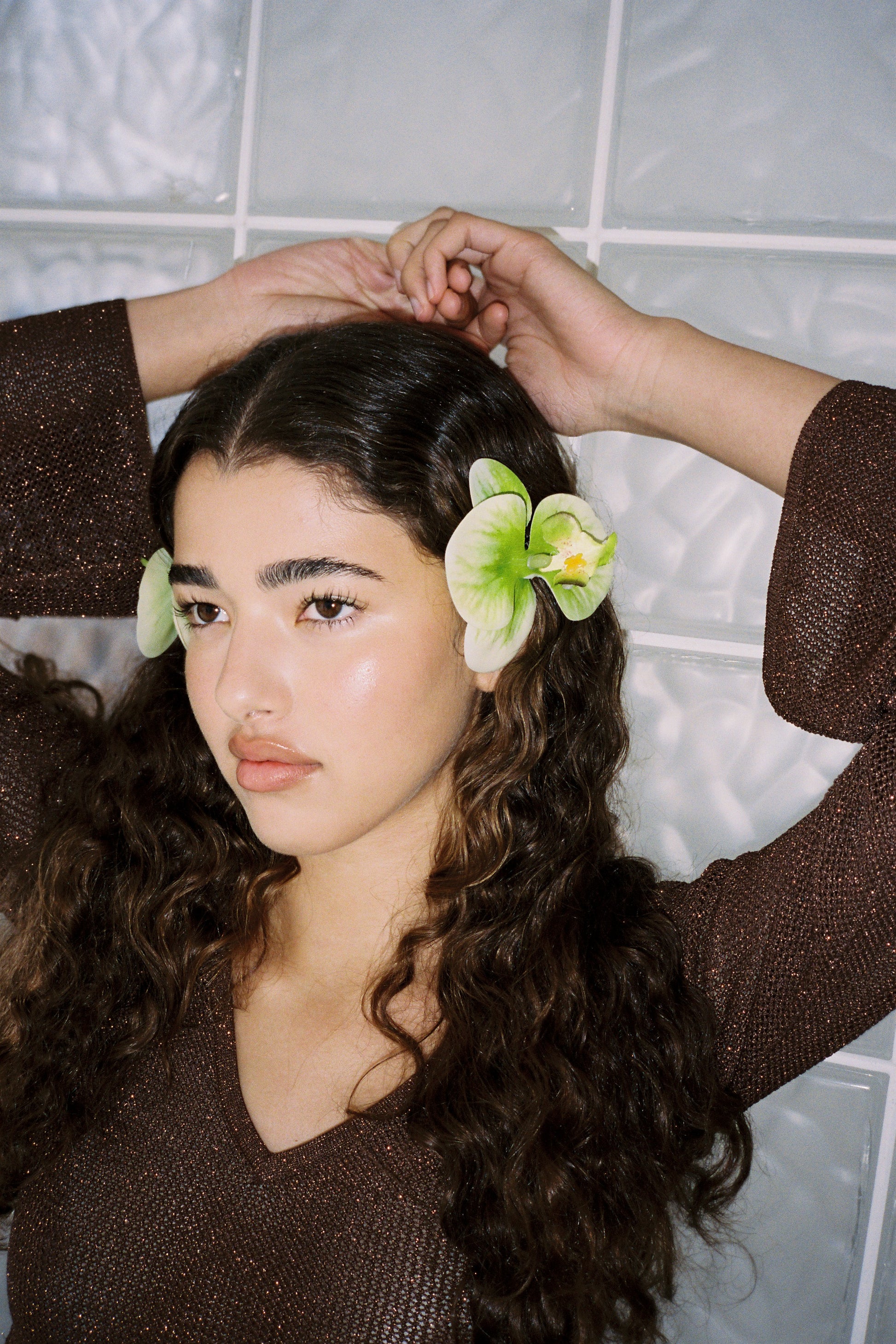 Slip into the Iris Blouse, the most stylish trans seasonal piece. This long-sleeved top features exquisite hand-crochet floral details and a stretchy knit that hugs your silhouette comfortably. The lurex thread adds a subtle metallic finish, giving it a touch of glamour. Wear the Iris Blouse solo for a chic, sophisticated style, or team it with the matching skirt for a coordinated look that seamlessly transitions from day to night.