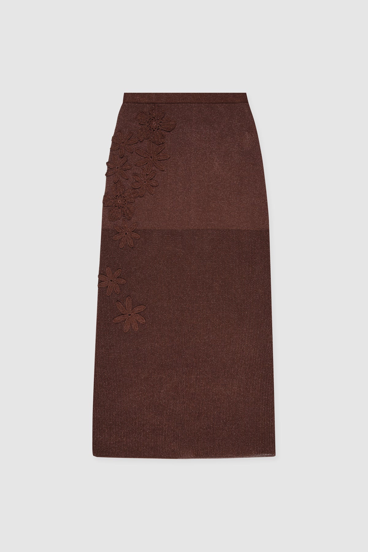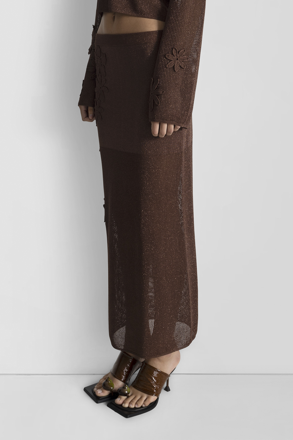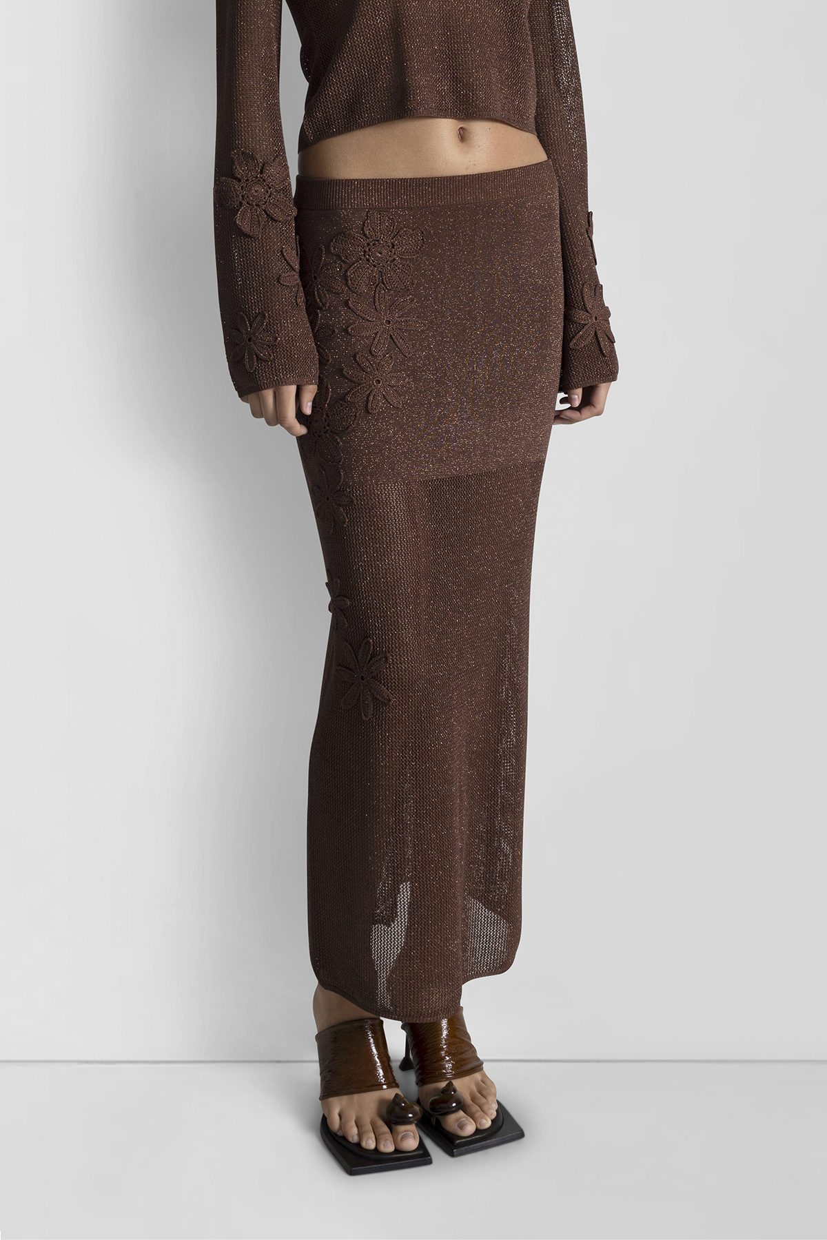 The luxurious Iris Maki skirt features hand-crochet floral details and a hint of lurex thread imparts a subtle shimmer. The stretchy knit fabric ensures a flattering and comfortable fit for all. Perfect for transitioning from daytime sophistication to evening glamour, the Iris Maxi Skirt pairs effortlessly with the Iris Blouse for a coordinated, polished ensemble.