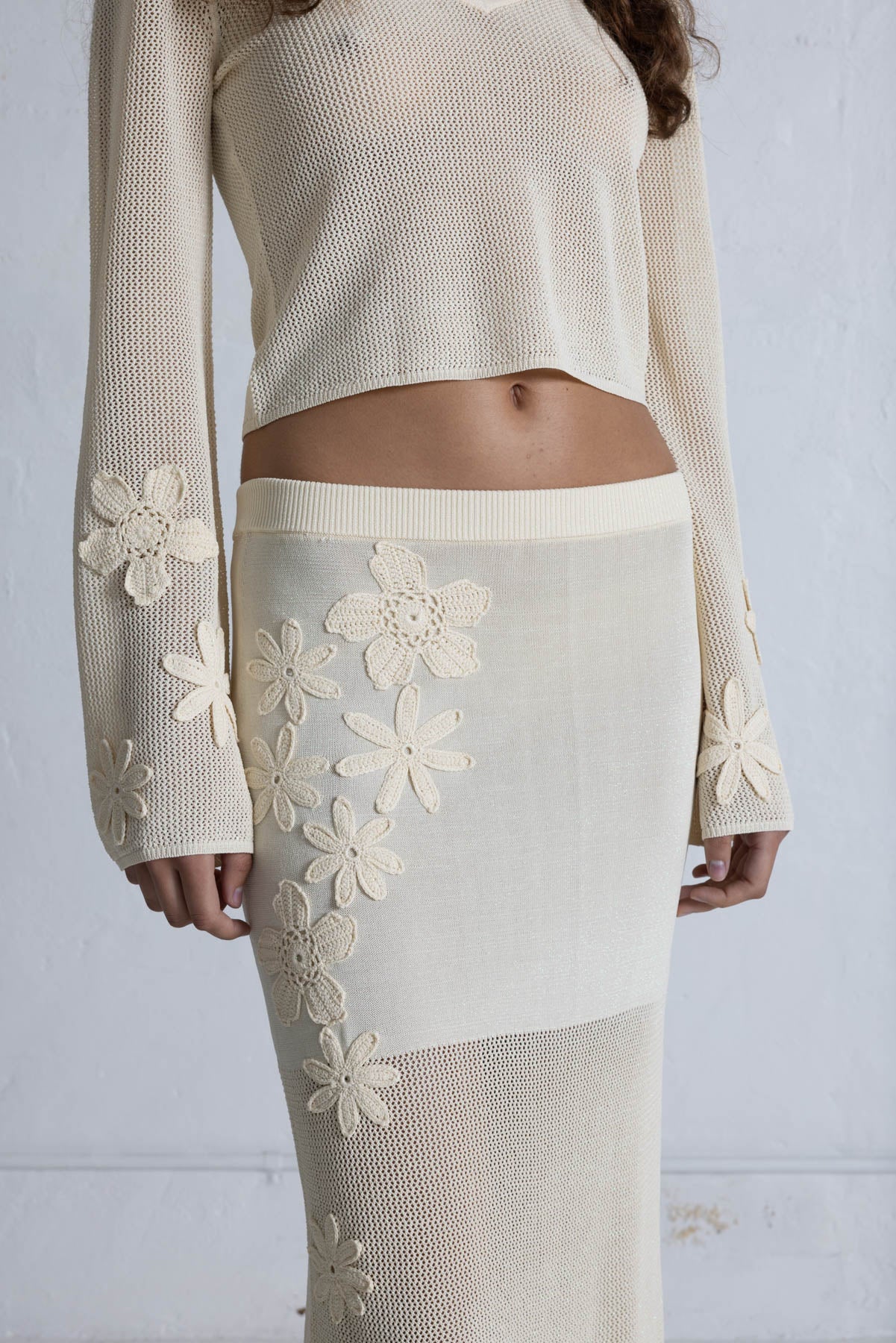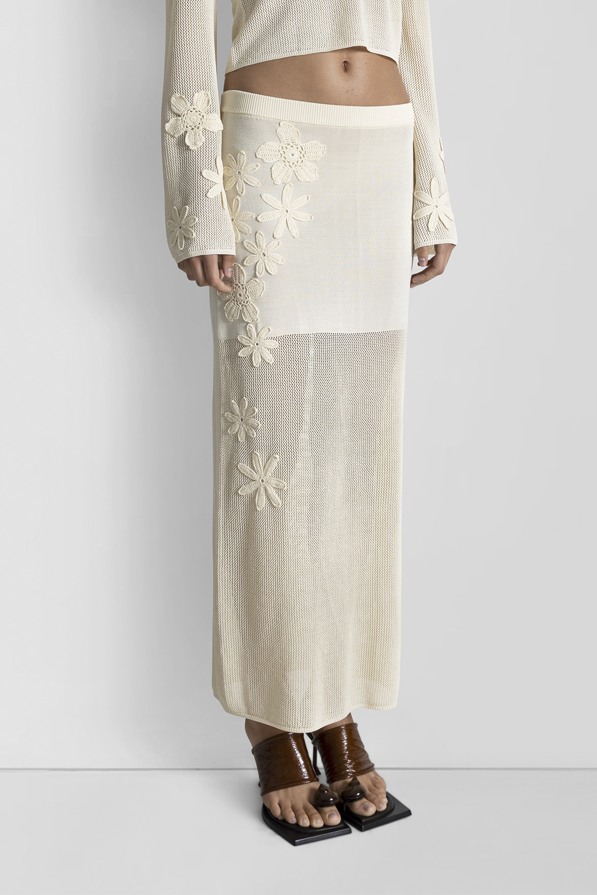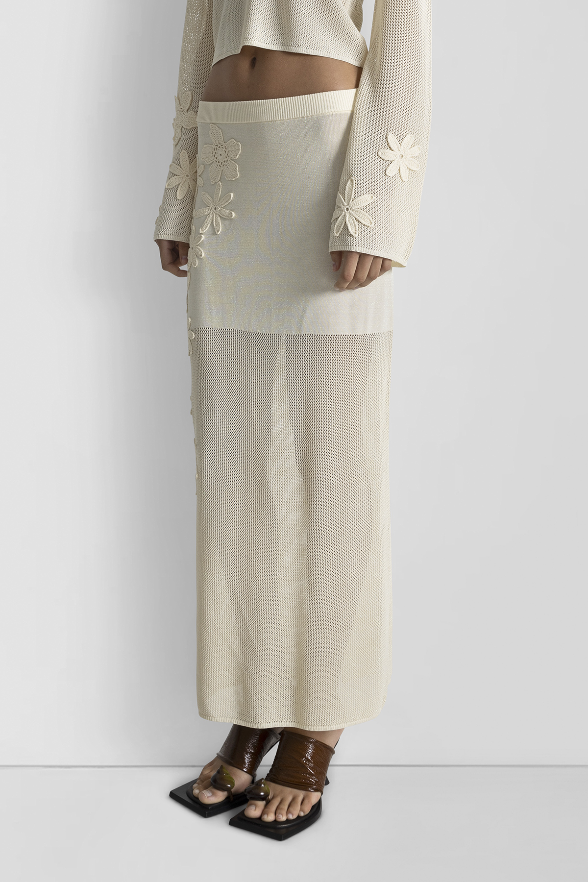 The luxurious Iris Maki skirt features hand-crochet floral details and a hint of lurex thread imparts a subtle shimmer. The stretchy knit fabric ensures a flattering and comfortable fit for all. Perfect for transitioning from daytime sophistication to evening glamour, the Iris Maxi Skirt pairs effortlessly with the Iris Blouse for a coordinated, polished ensemble.