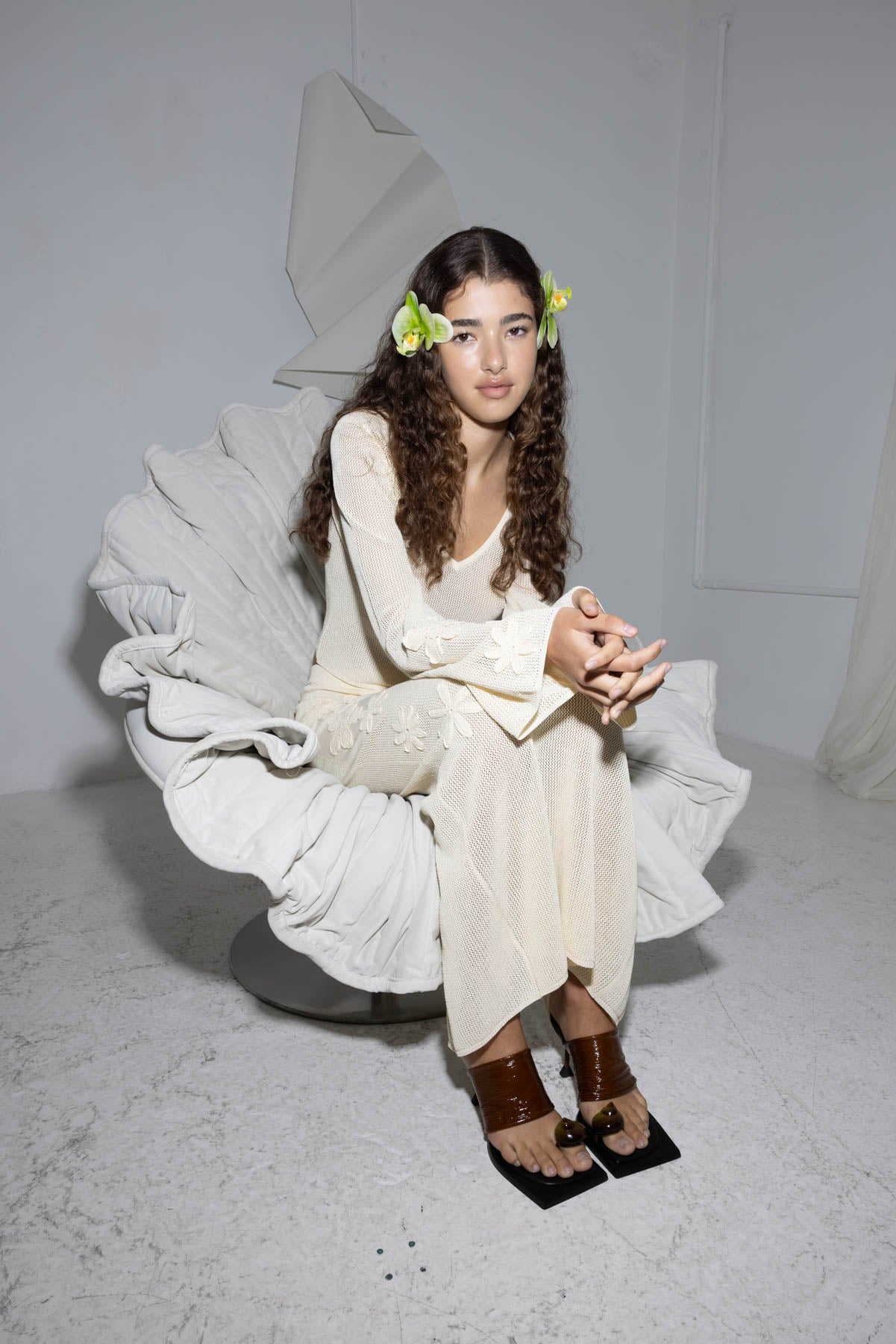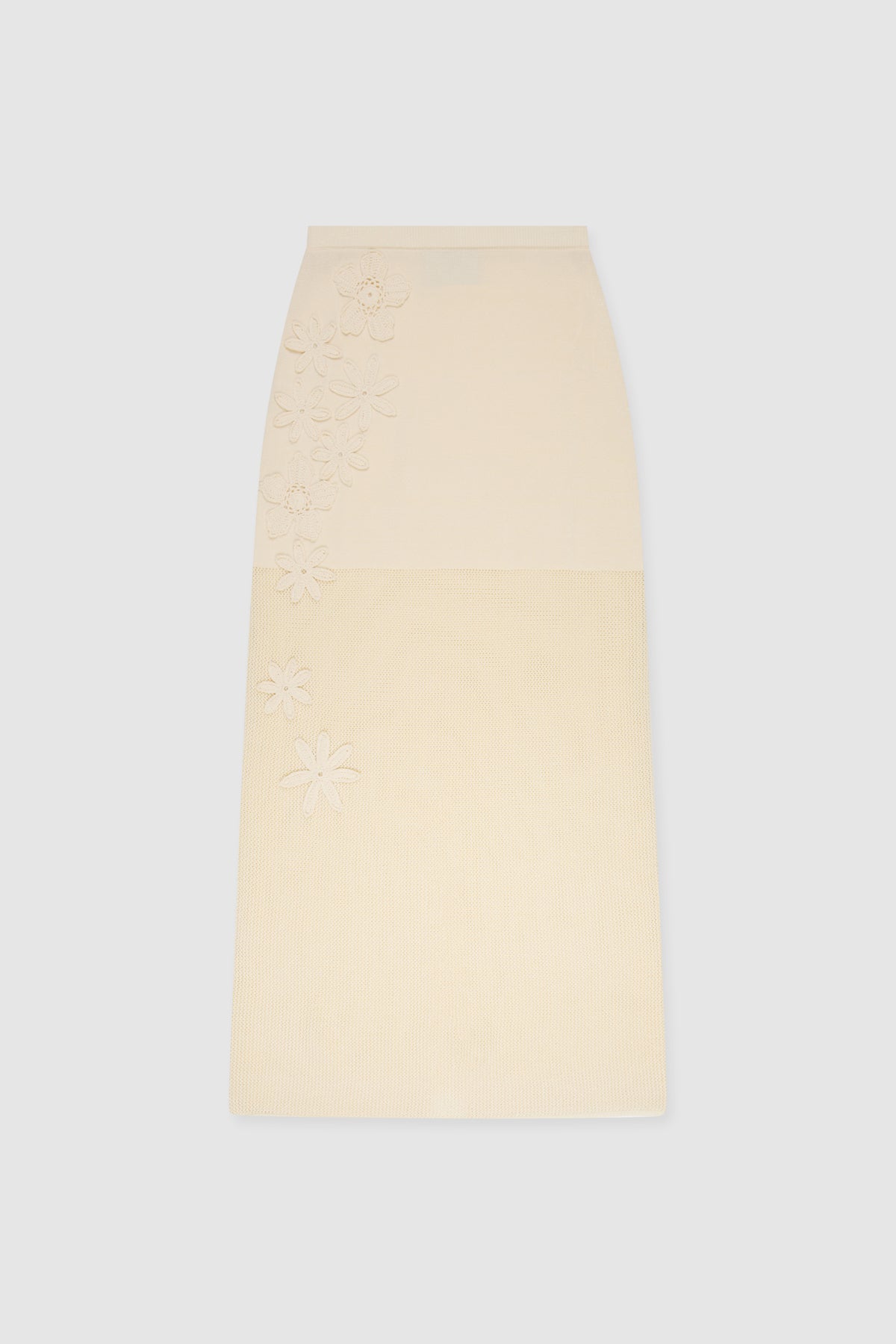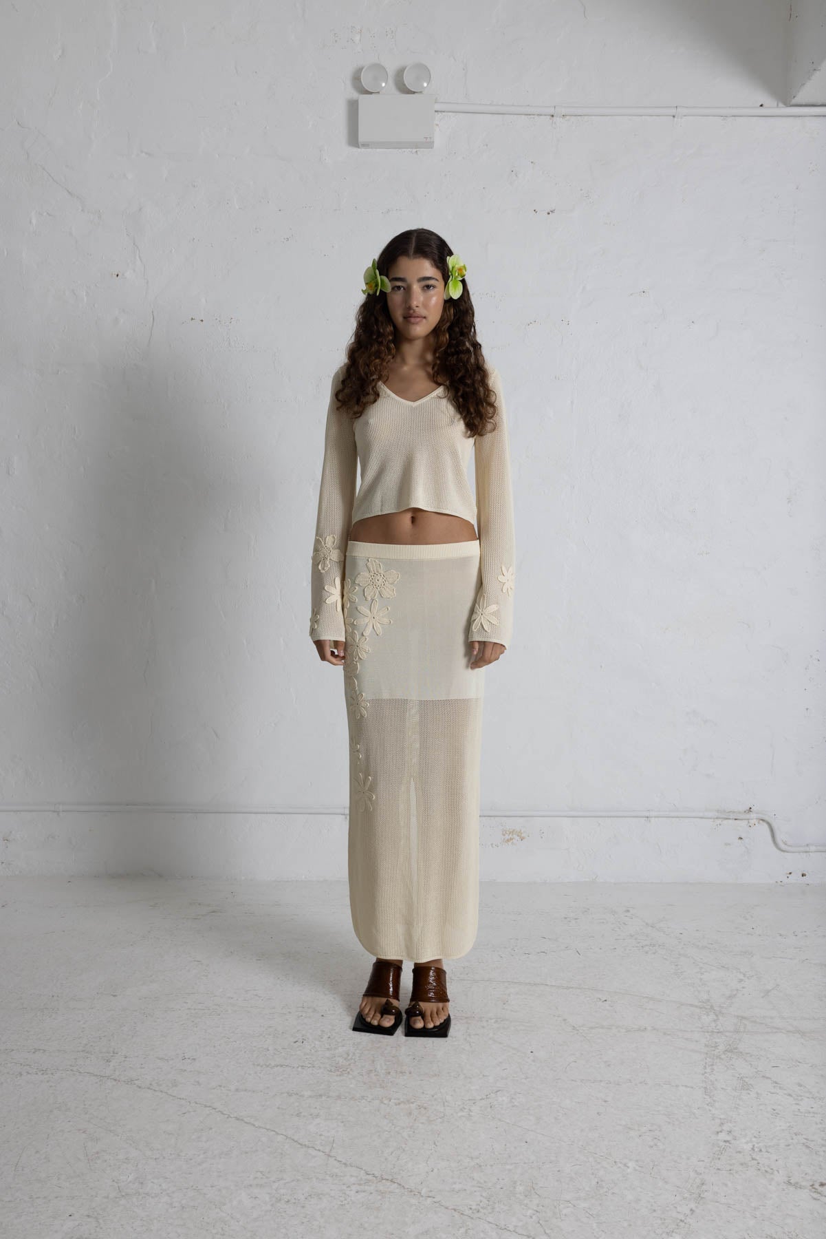 The luxurious Iris Maki skirt features hand-crochet floral details and a hint of lurex thread imparts a subtle shimmer. The stretchy knit fabric ensures a flattering and comfortable fit for all. Perfect for transitioning from daytime sophistication to evening glamour, the Iris Maxi Skirt pairs effortlessly with the Iris Blouse for a coordinated, polished ensemble.