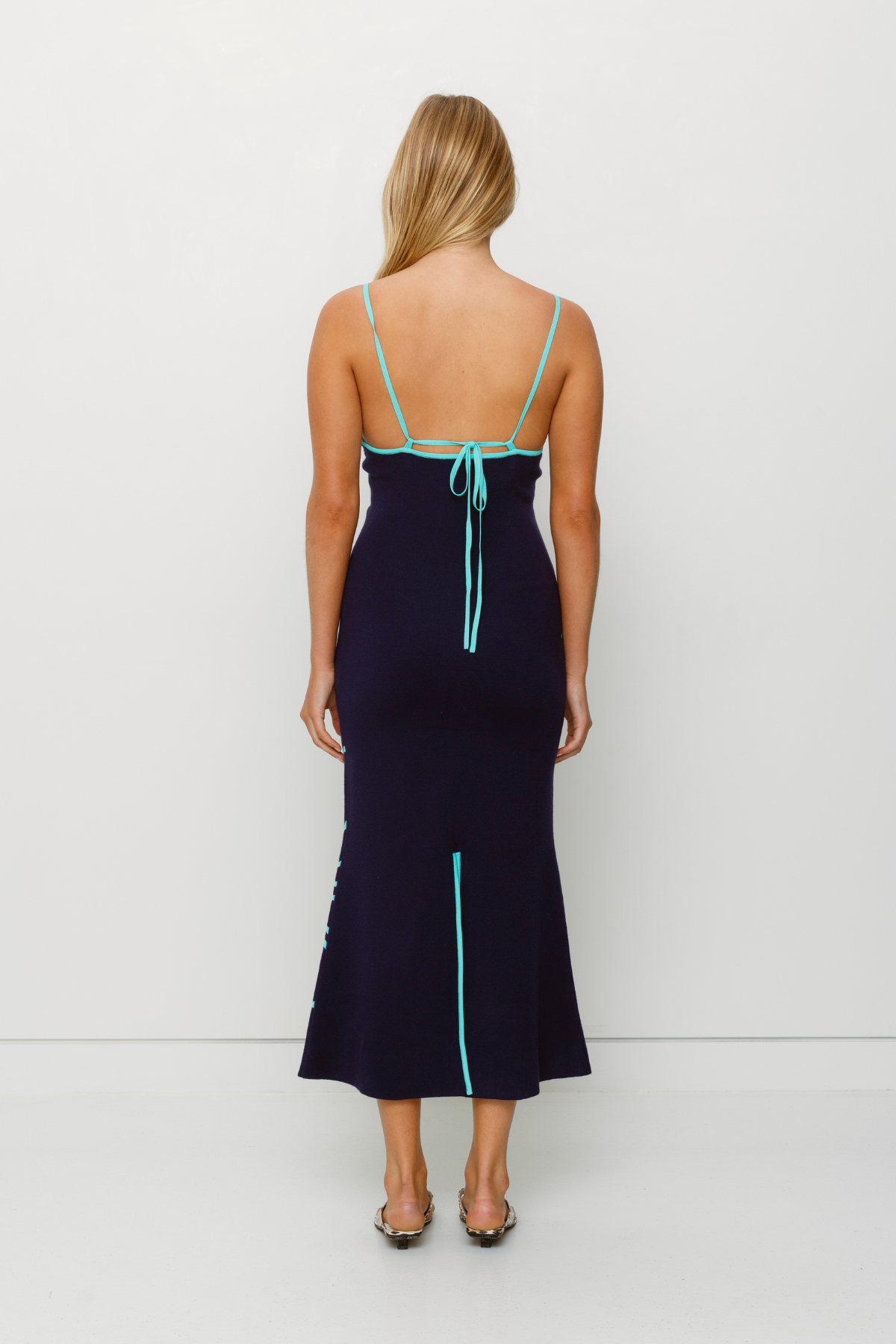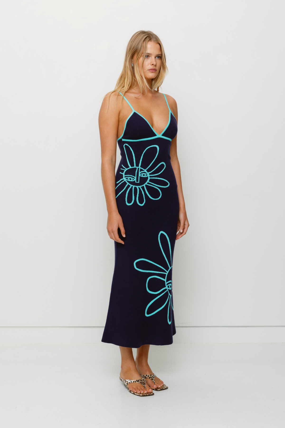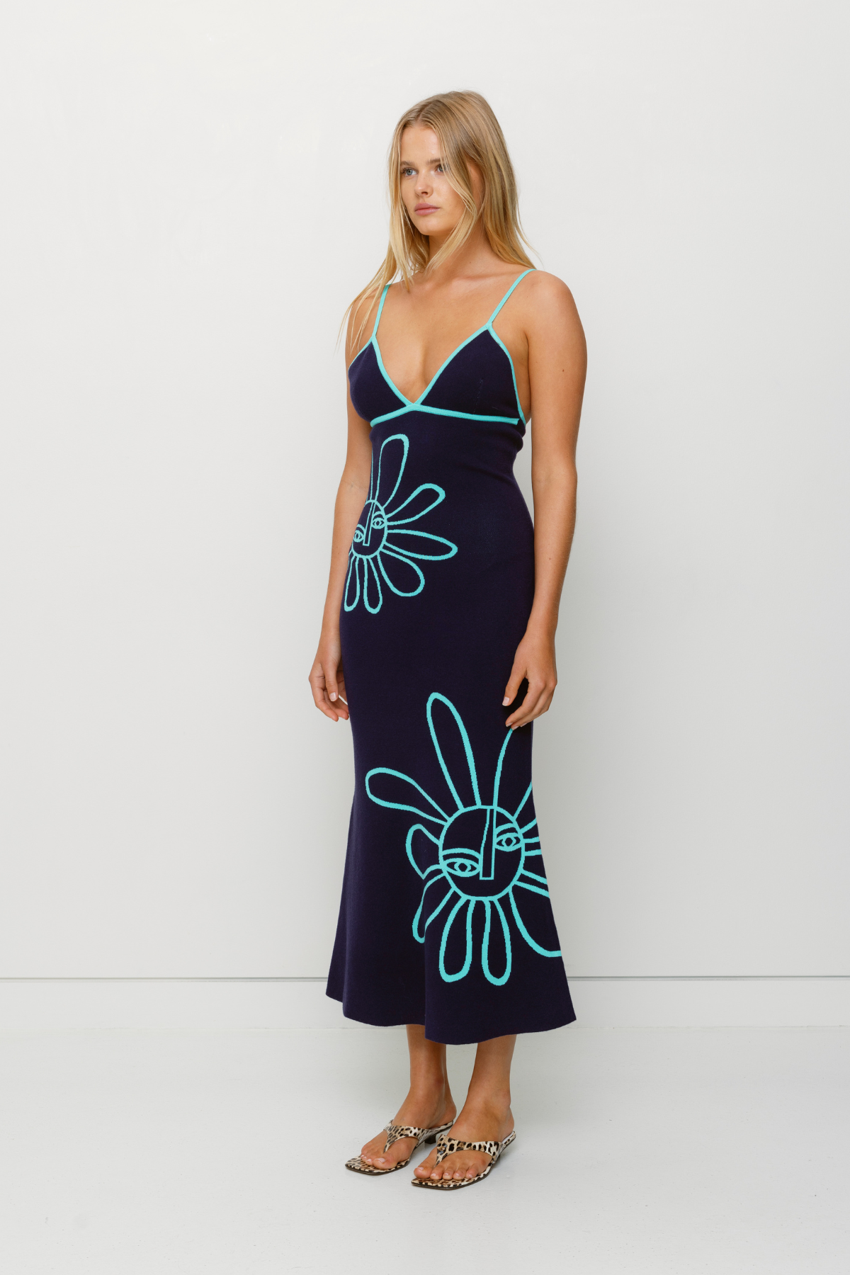 Introducing the Soleil Knit Midi Dress. Crafted from a soft yet form-fitting intarsia knit and adorned with this season's custom flower motif, the Soleil offers both comfort and style. Featuring thin contrasting straps, a low back, and a V-scoop neckline, it’s the perfect blend of chic and ease. Pair it with your favourite stylish flats for the ultimate sunset dinner look.