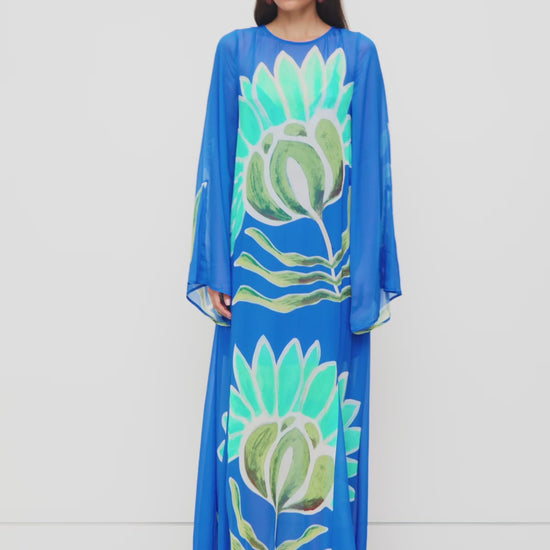 The Solsana Long Sleeve Dress makes a bold entrance. A lightweight and airy sheath floats over the body, with flared sleeves and a sweeping hemline. Crafted in our hand-drawn Fern flower print, designed in collaboration with print artist Sally Hungerford. Featuring a removable slip, the Solsana can alternatively be styled with a bodysuit or swimwear underneath for a sheer statement.