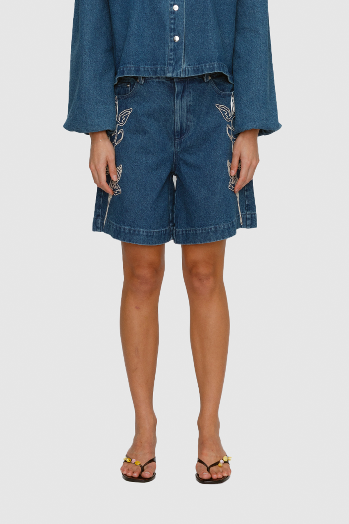 The Wynn Denim Short is a longline denim short, in a classic dark indigo wash. Featuring custom rope embroidery, designed in house.