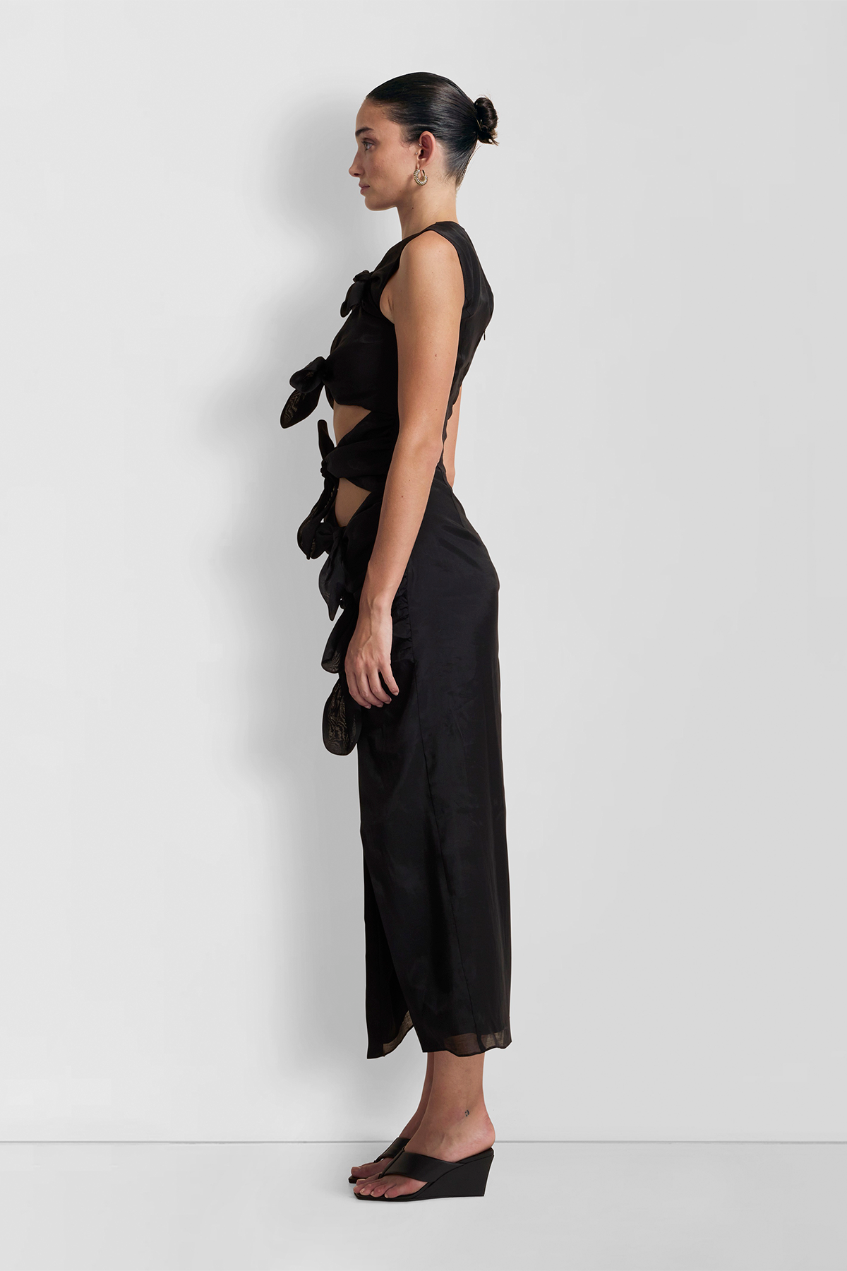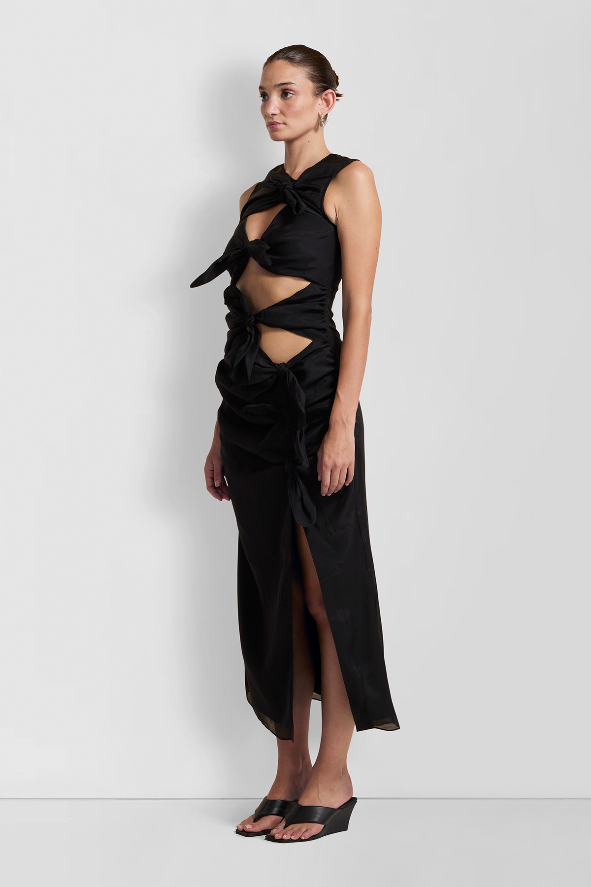 Make a lasting impression with the Allegra Midi Dress. A stunning formal midi dress featuring striking functional bow details, keyhole cut outs and sexy leg cut out. Wear the Allegra Midi to your next garden wedding, black tie dinner or cocktail party celebration.