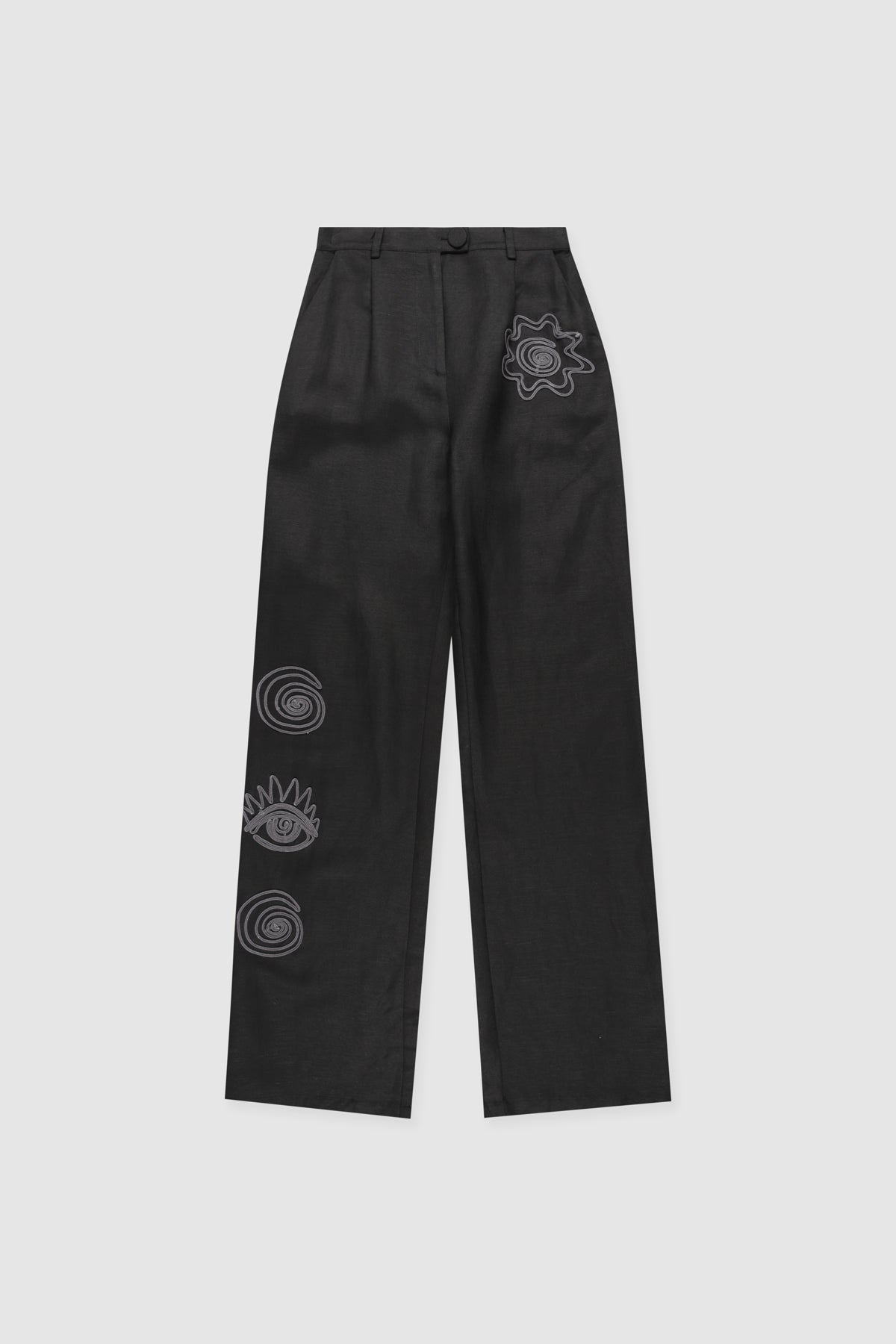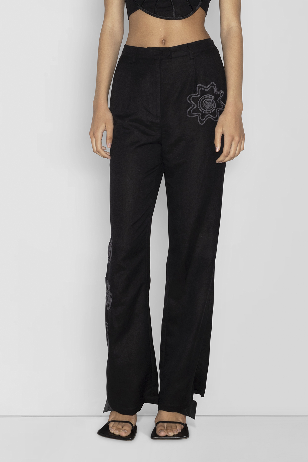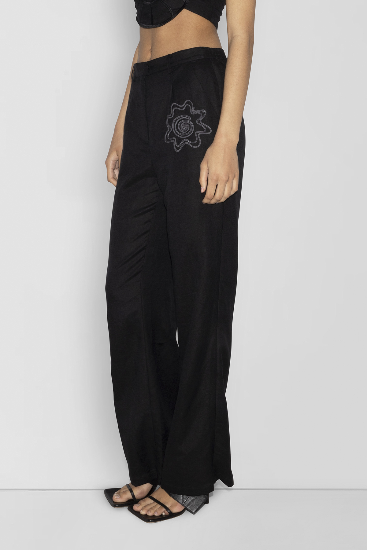 Introducing the Cara Shell Pants, the perfect complement to your wardrobe. These wide-leg beauties feature hand-drawn embroidered motifs that add a touch of artistry and elegance. The back waistband is elasticated for a comfortable, customised fit. Wear them on their own for a sophisticated look or pair them with the matching Cara Bustier.