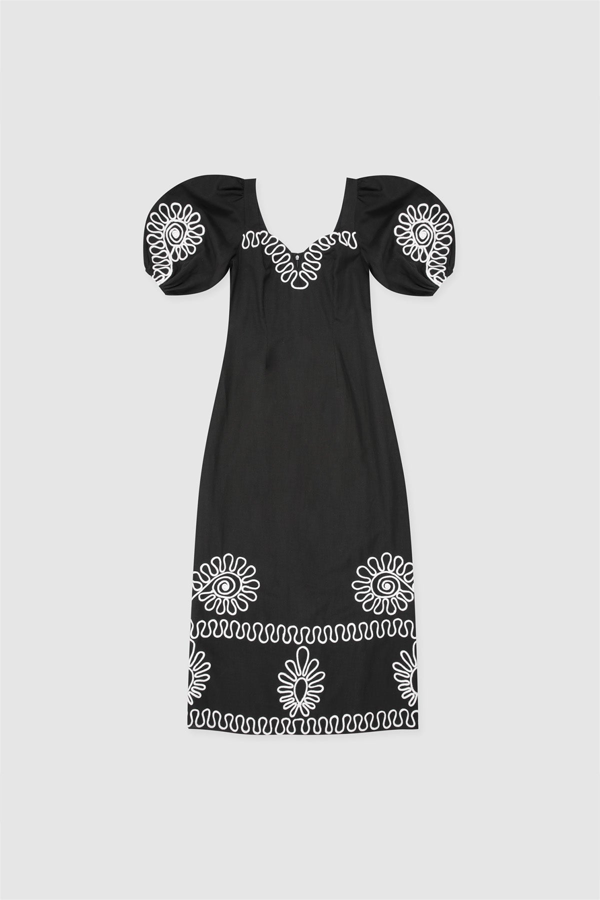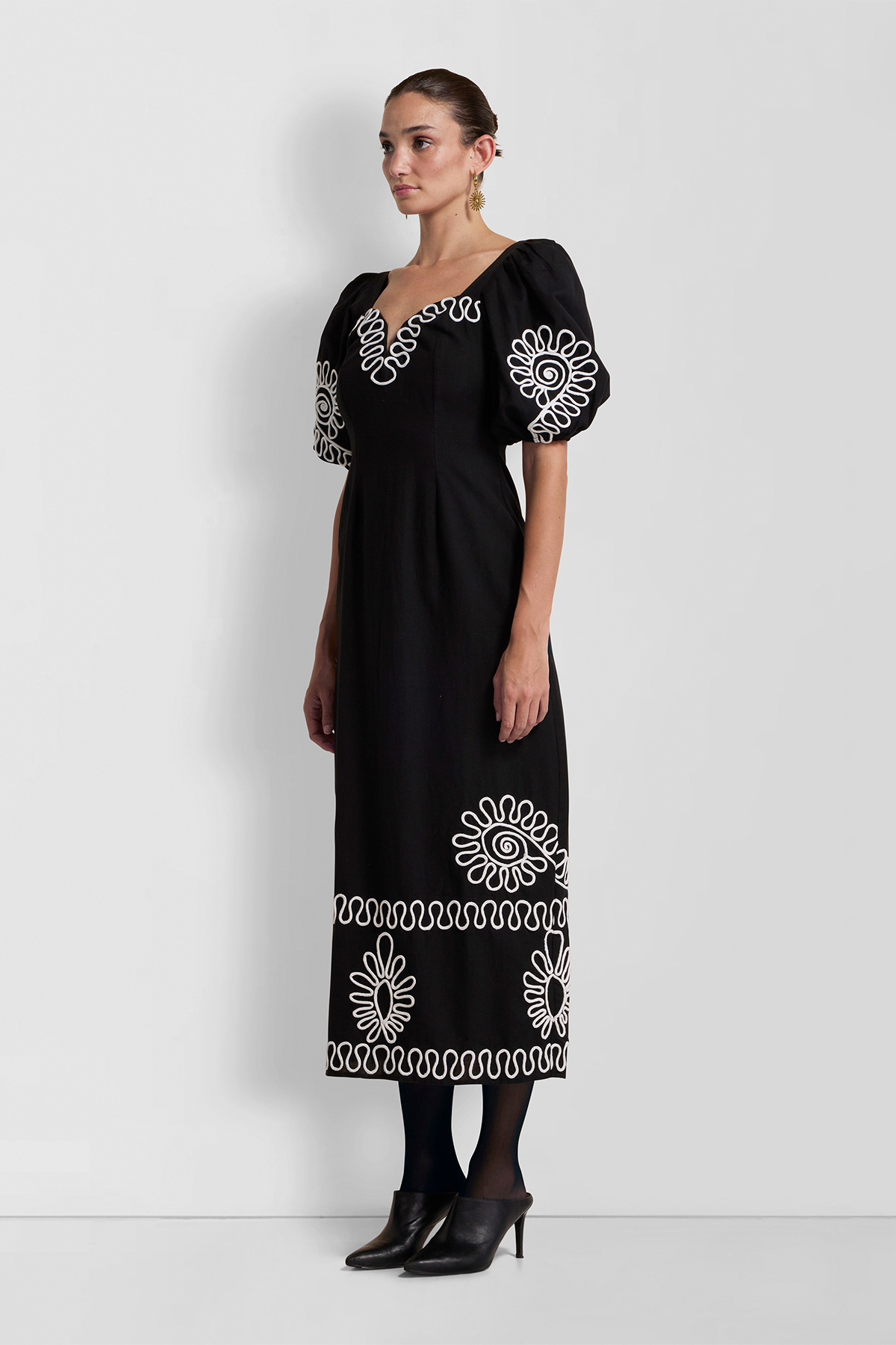 The Carmensita Embroidered Midi Dress features a playful sweetheart neckline, belle sleeves and custom rope embroidered detail by our artisan makers in India. With a timeless elegance perfect for various occasions, this dress is designed to grace any event with effortless charm and style.