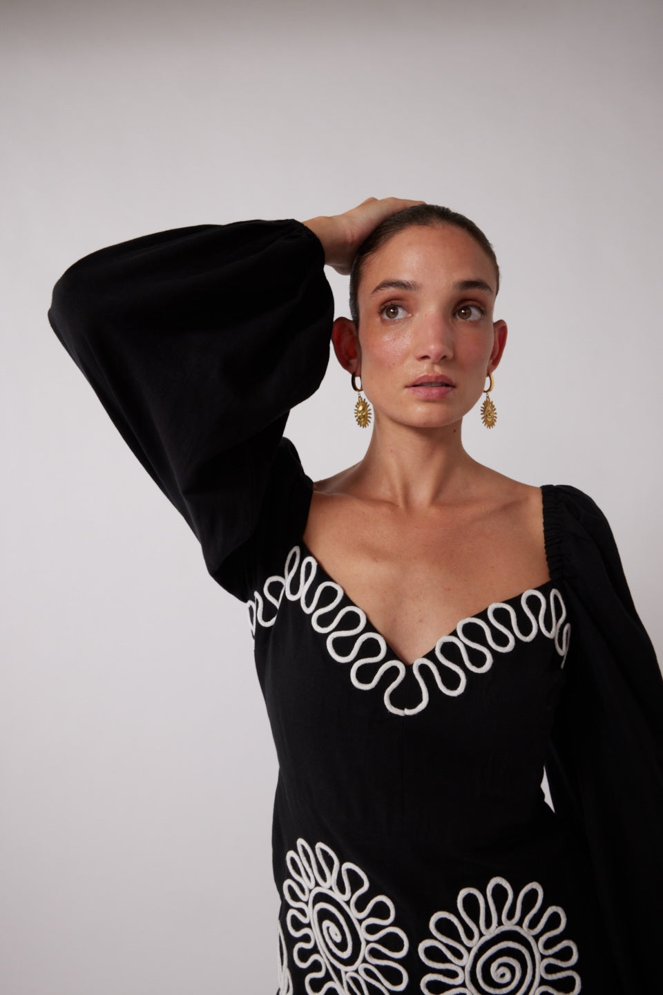 The Carmenista Mini Dress embodies artisan craftsmanship, meticulously crafted by skilled hands in India. With its long bell sleeves adorned with elastic cuffs, this dress exudes elegance and versatility suitable for any occasion.¬â€