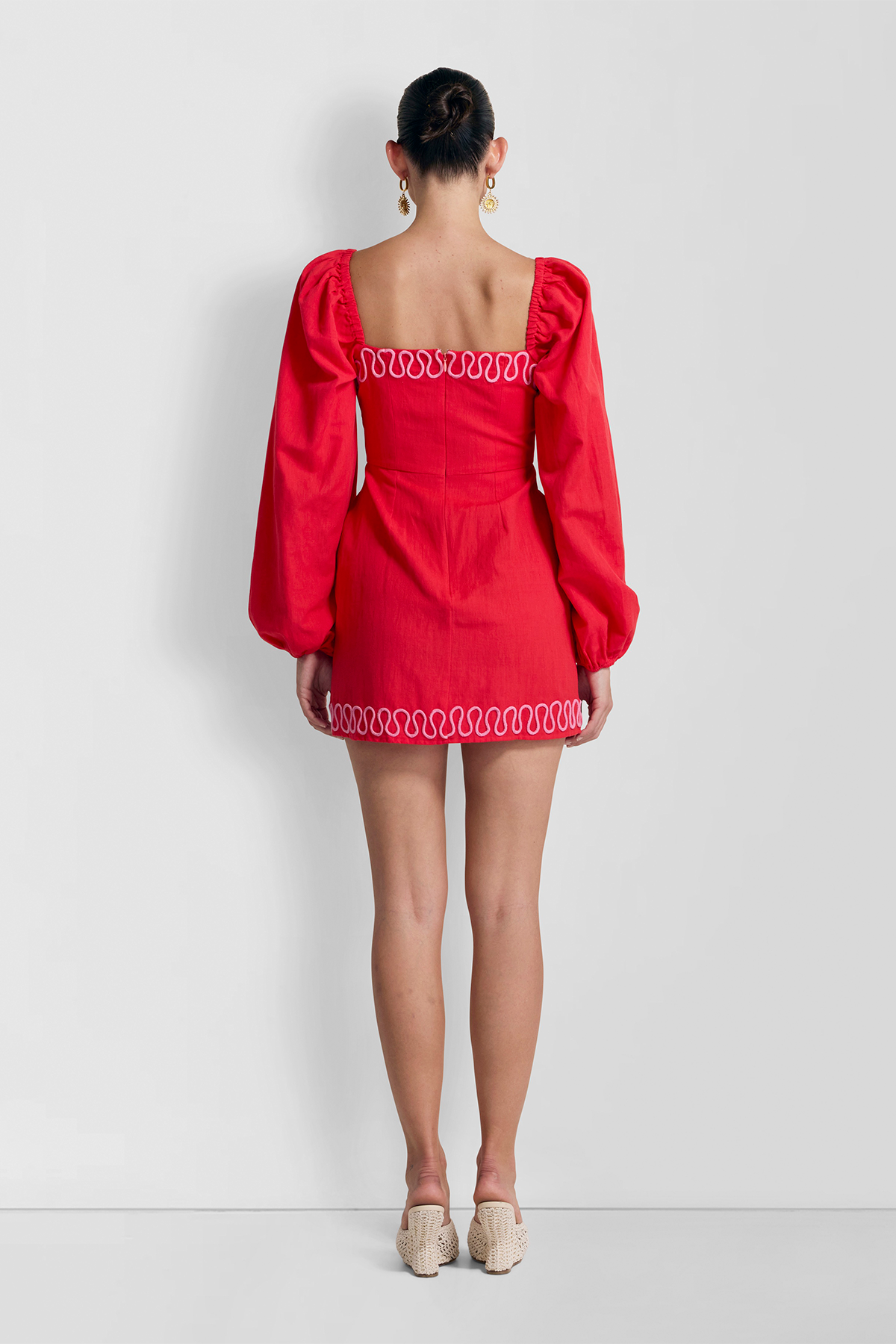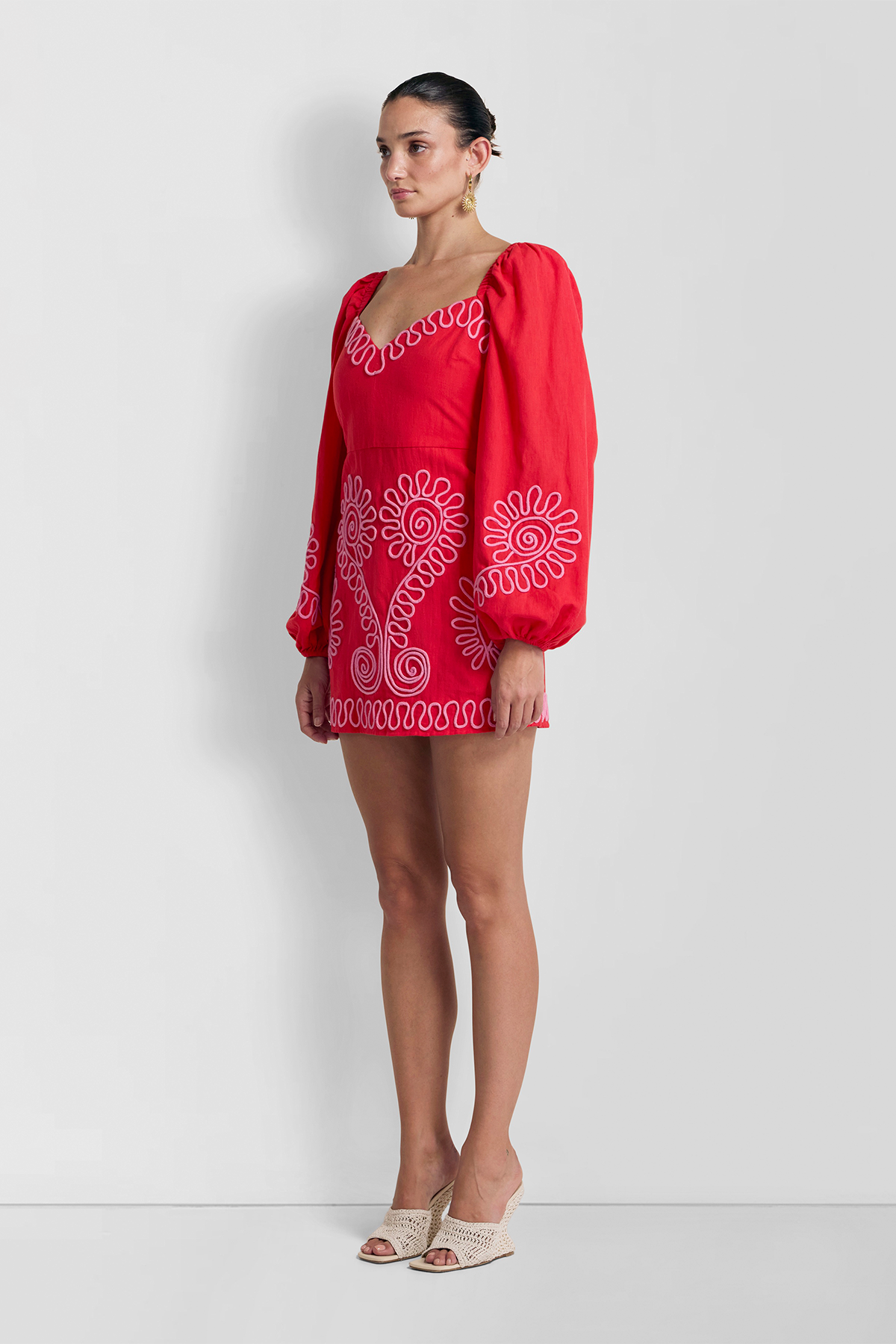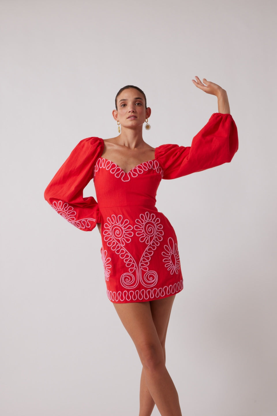 The Carmenista Mini Dress embodies artisan craftsmanship, meticulously crafted by skilled hands in India. With its long bell sleeves adorned with elastic cuffs, this dress exudes elegance and versatility suitable for any occasion.¬â€