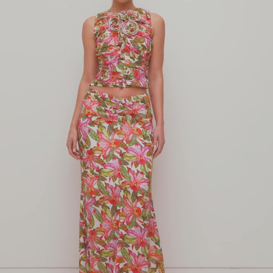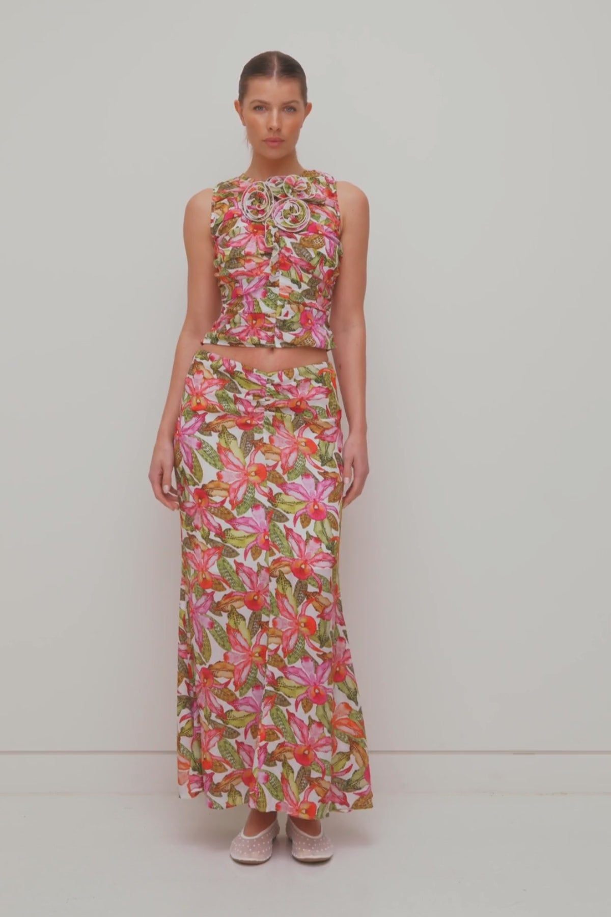 A statement in motion, the Catia Maxi Skirt showcases our custom TWG floral print in vibrant shades of green and pink. Designed with a flattering V-shaped waistband and subtle ruching through the front, it falls into a flowing A-line silhouette with a mermaid-inspired, fluted hem. Dressy yet street-ready, Catia is the cool-girl piece that turns heads—worn solo or paired with the matching top for a striking coordinated set.