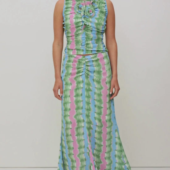 Soft and striking, the Catia Maxi Skirt shines in a dreamy blue-green pastel stripe, evoking the ease of summer skies and ocean horizons. Crafted in our custom tie-dye print, it’s designed with a flattering V-shaped waistband and delicate ruching through the front, before flowing into an A-line silhouette with a mermaid-inspired, fluted hem. Effortlessly versatile yet statement-making, Catia brings a cool-girl edge to dressy daywear and evening escapes alike. Wear it solo or style with the matching top for a coordinated set that feels endlessly fresh.