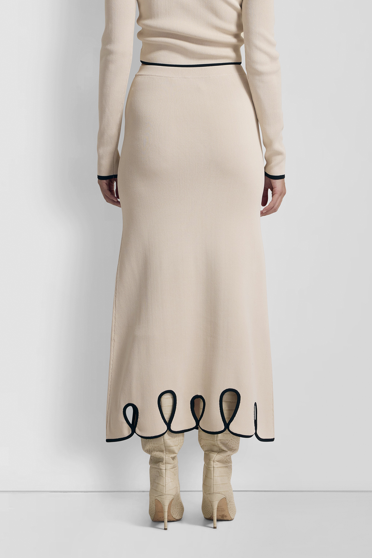 Introducing the Deja Knit Skirt, a must-have piece for your wardrobe. Crafted from a soft, stretchy knit fabric, this skirt has an unique waved hem detail and contrast colour. Pair with a casual top for daytime outings or dressed up with the matching Deja Knit Top to make a real statement.Â