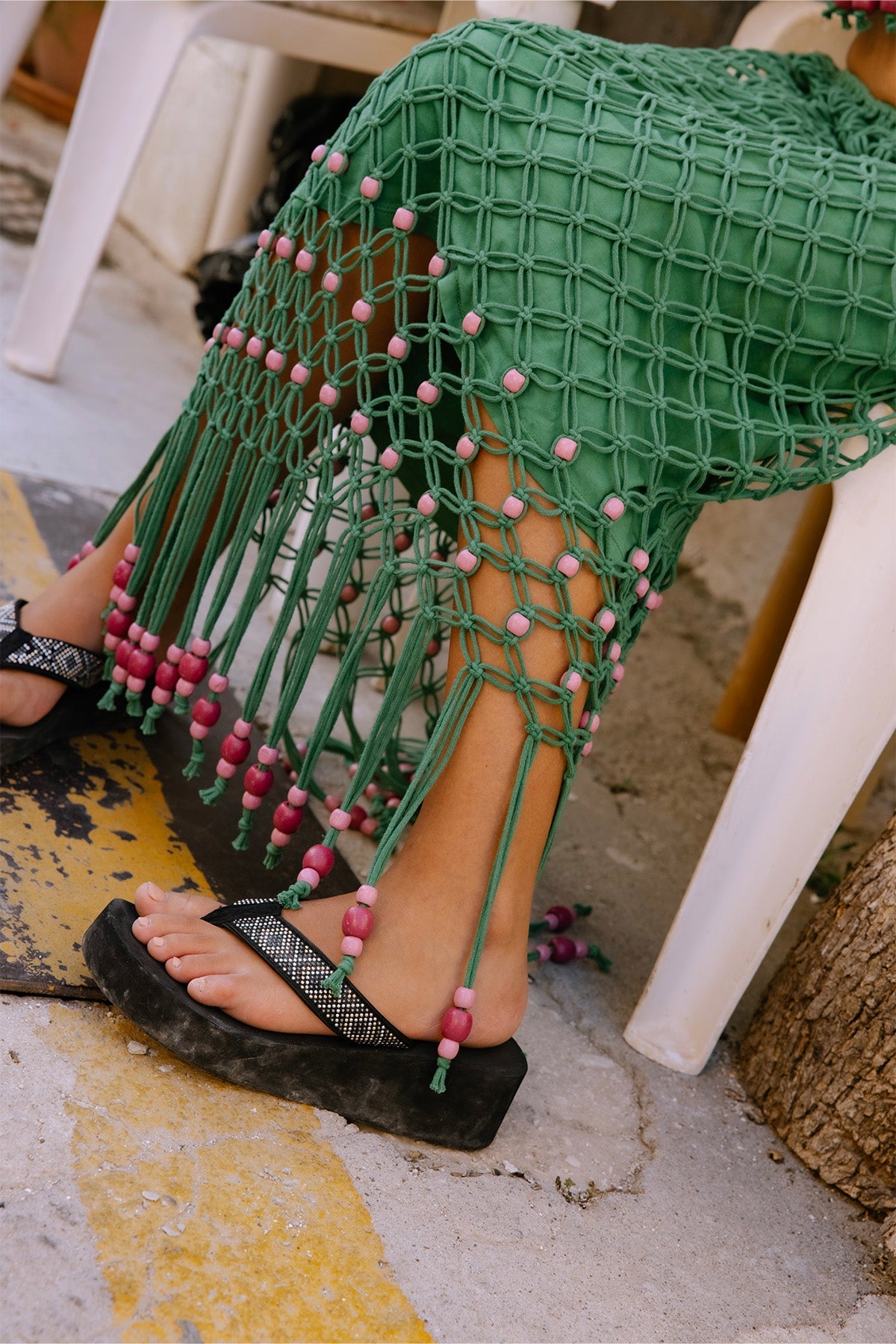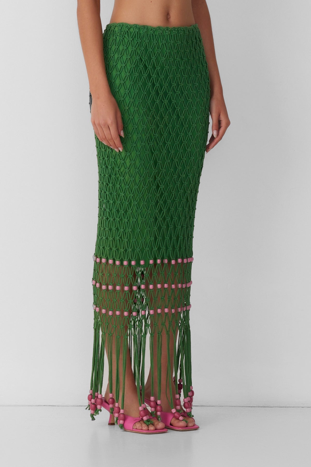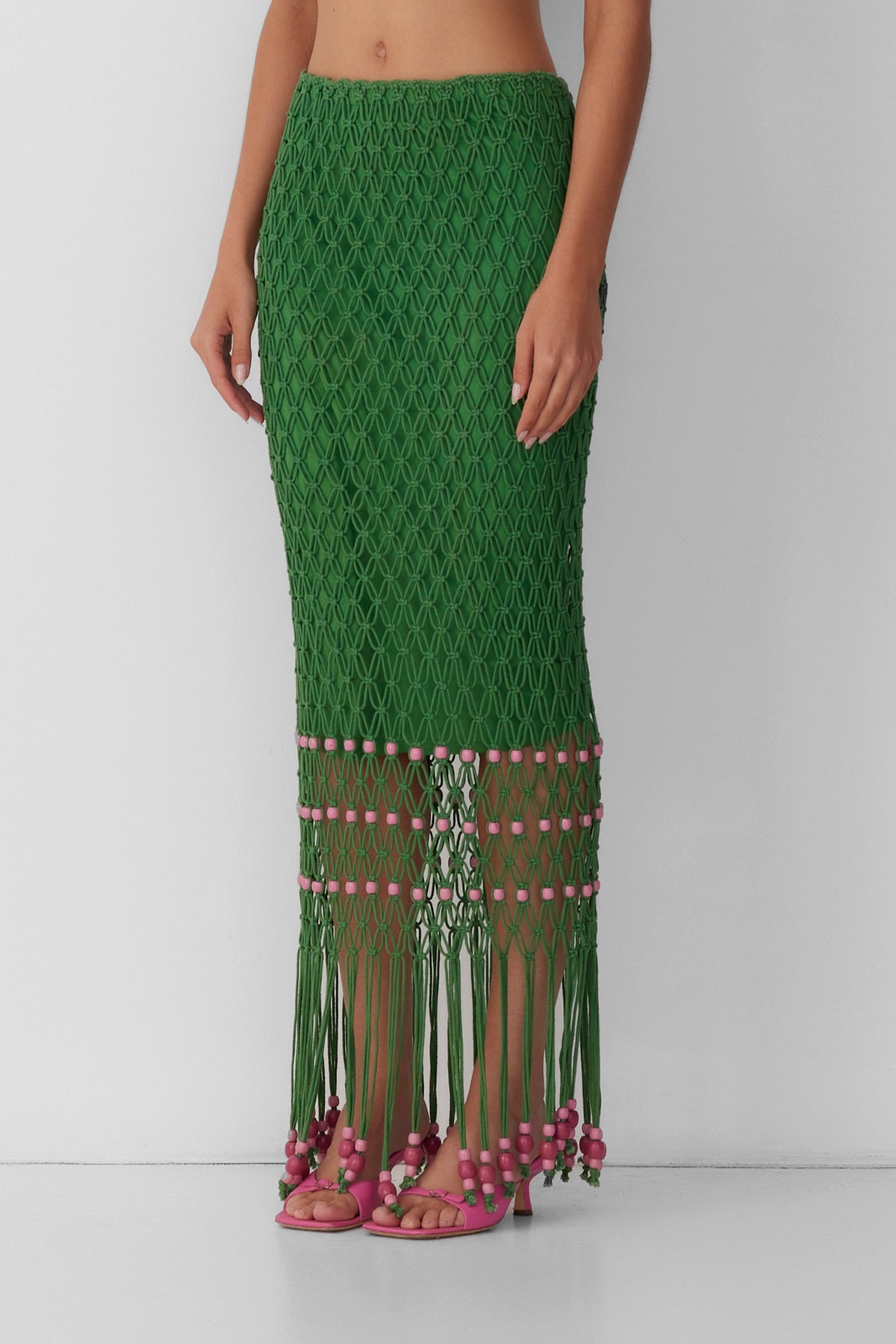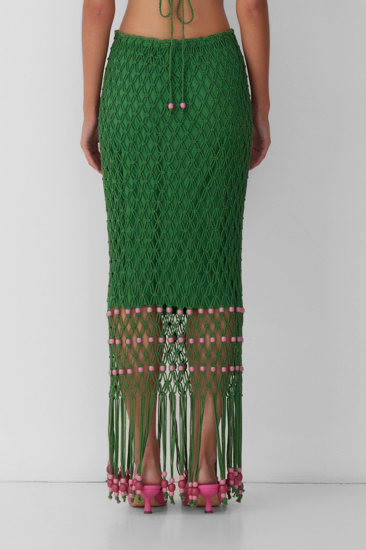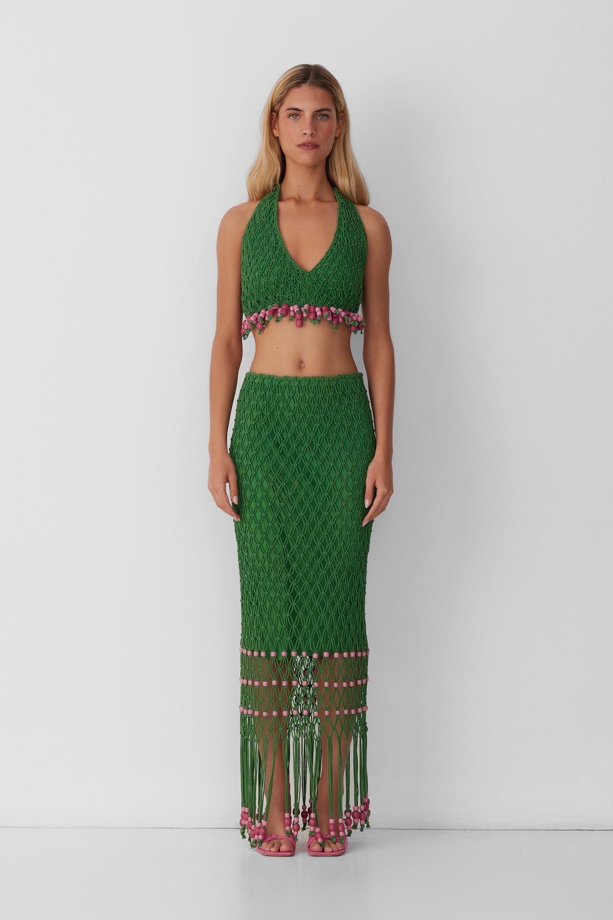 Meet the Reis Beaded Macrame Skirt, part of a statement set designed to treasure. Handmade macrame weaving, finished with a contrast beaded hem; the Reis set is perfect for festival and event wear.
