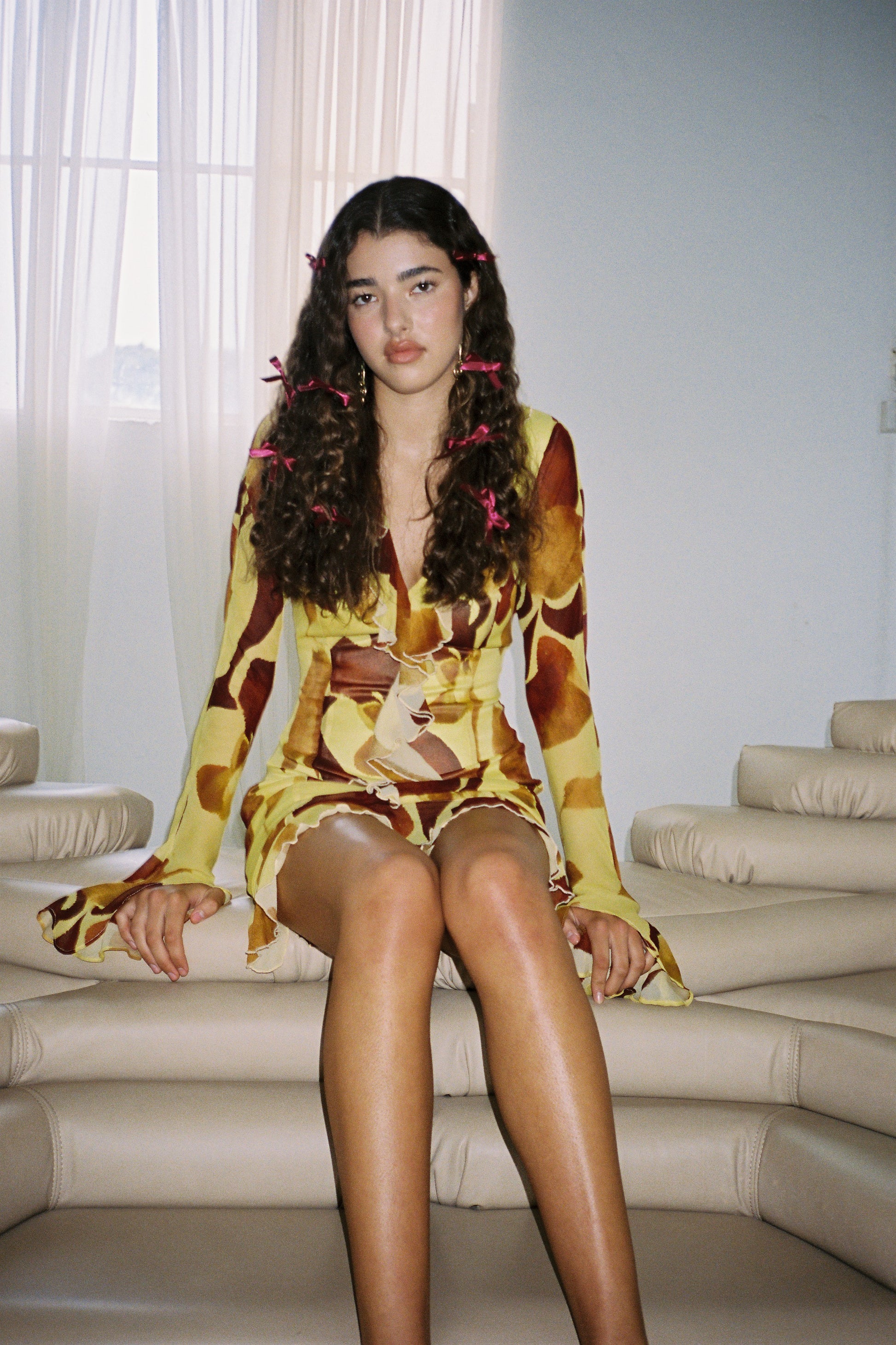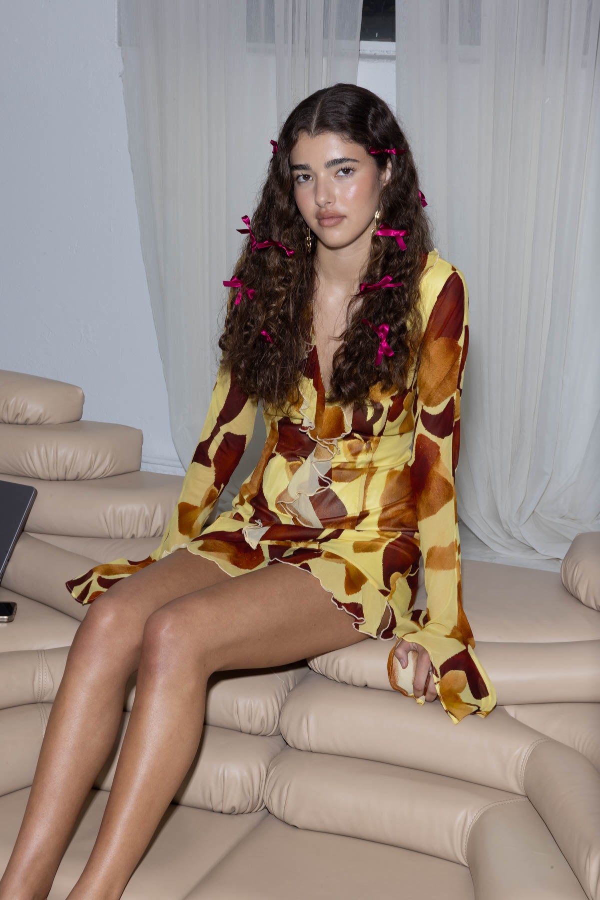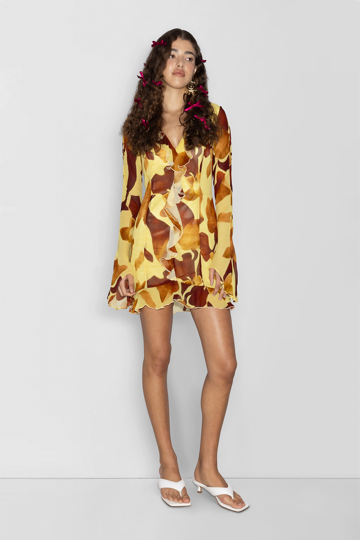 Introducing the Rhapsody Mini Dress. Adorned with ruffle detailing, this breezy, mini features a front split for flowing movement and a statement look. Pair it with your favourite accessories for a playful yet sophisticated outfit that's ready for any occasion.