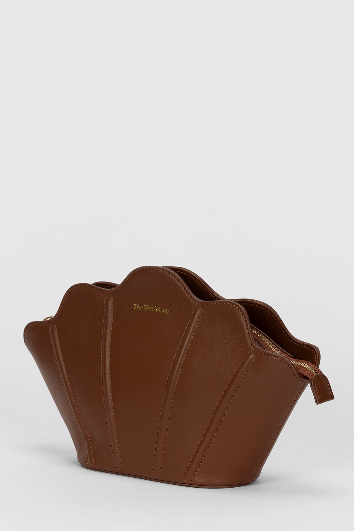 - Shell shaped clutch with waved top edge, and ridged details on front and back