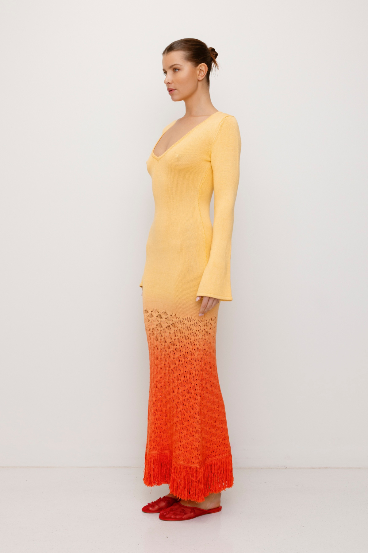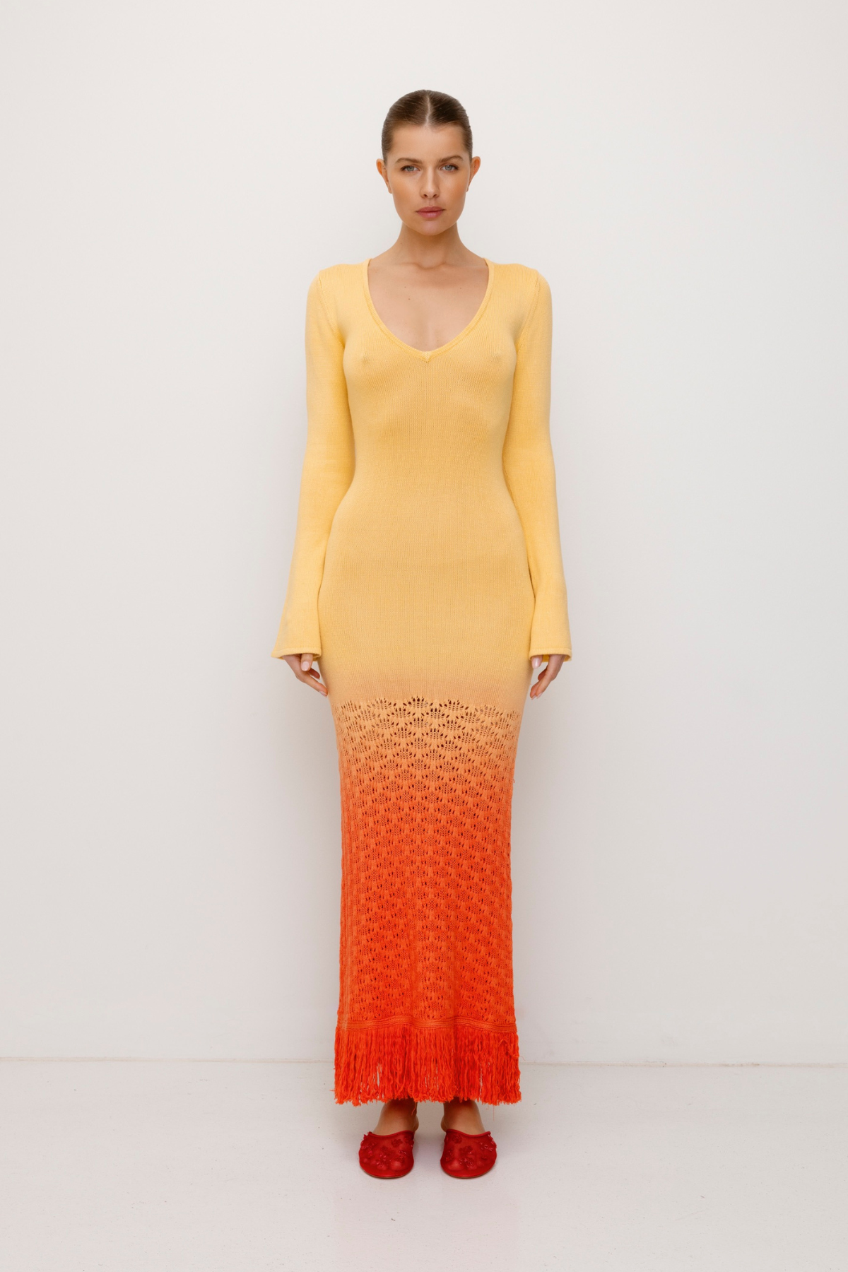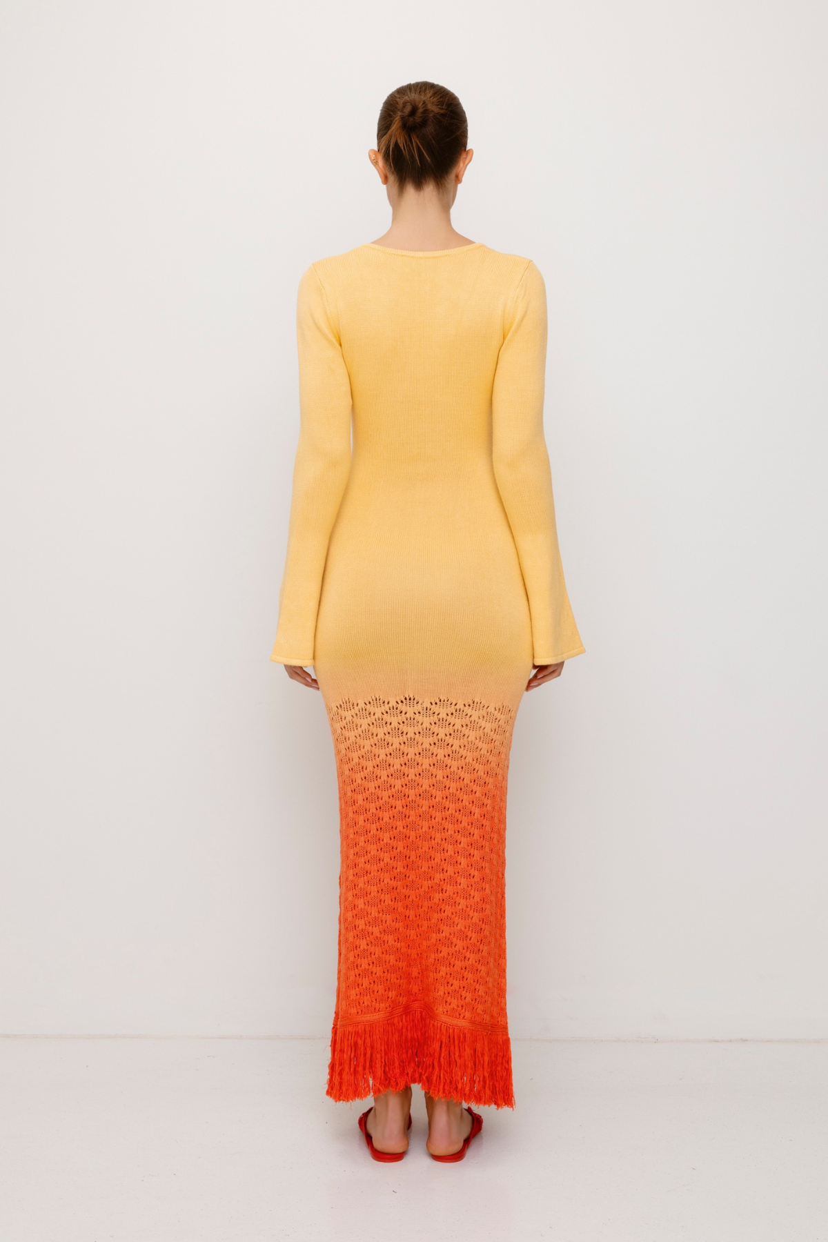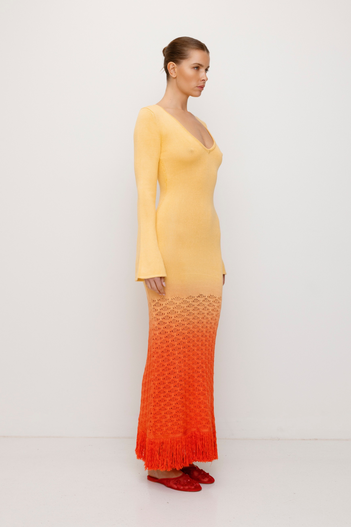 Inspired by the sunset the Zinna Sleeved Maxi Dress is your ultimate summer dress. Inspired by our much loved Zinna Dress featuring a custom weave detailed fringe hem, stunning ombre colours and stretchy fit (making it the most perfect bump friendly style). Pair with cute flats and your favourite hand bag for a night out on the coast.