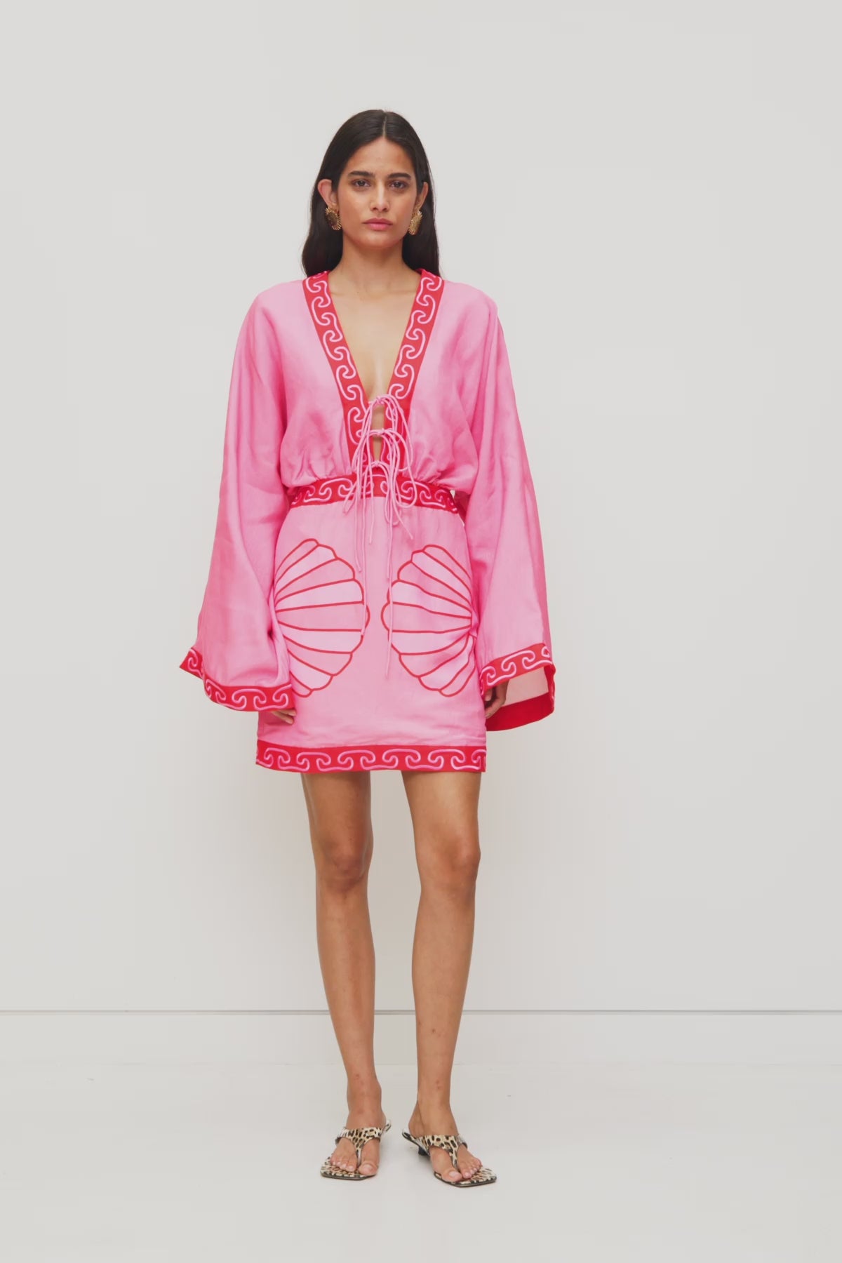 Designed for warm days and breezy evenings, the Concha Mini Dress blends comfort with effortless style. Featuring wide kimono-inspired sleeves, a flattering low V-neck with lace-up detailing, and a custom shell placement print, this mini dress is easy to wear and endlessly versatile.
