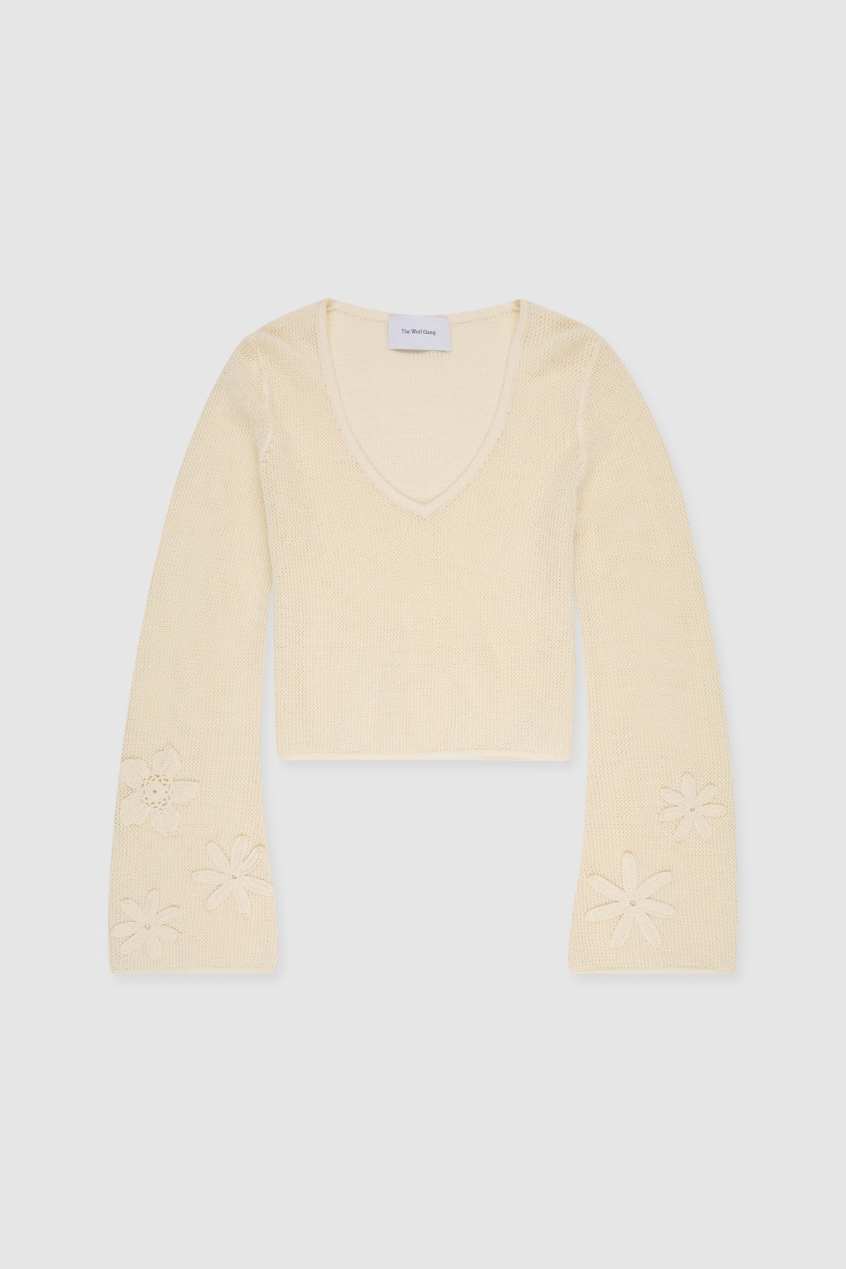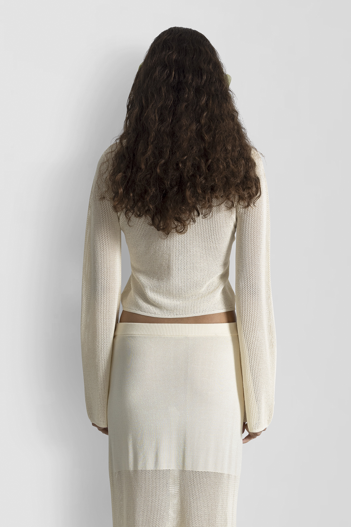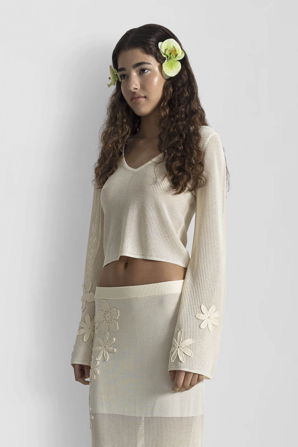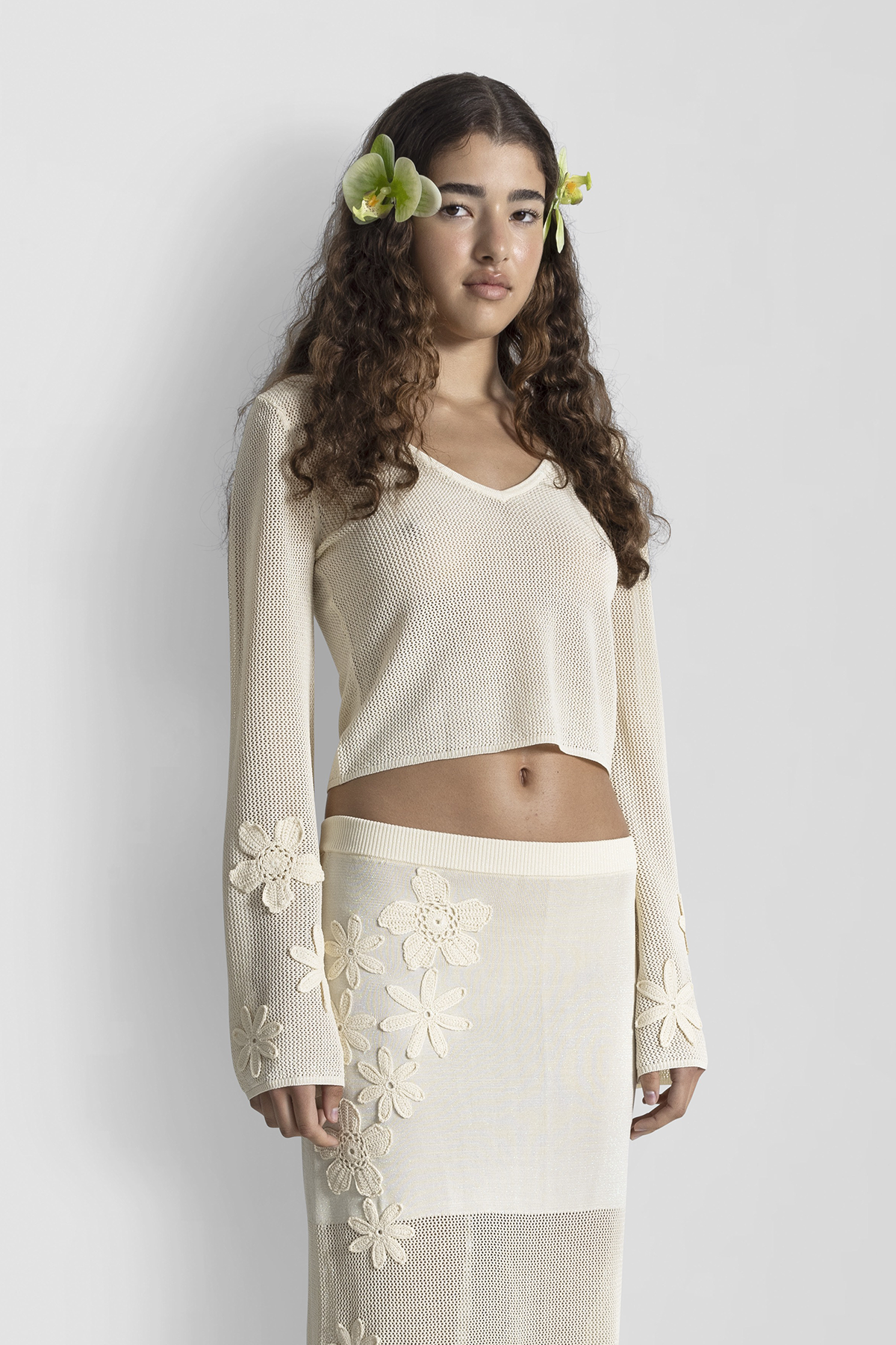 Slip into the Iris Blouse, the most stylish trans seasonal piece. This long-sleeved top features exquisite hand-crochet floral details and a stretchy knit that hugs your silhouette comfortably. The lurex thread adds a subtle metallic finish, giving it a touch of glamour. Wear the Iris Blouse solo for a chic, sophisticated style, or team it with the matching skirt for a coordinated look that seamlessly transitions from day to night.