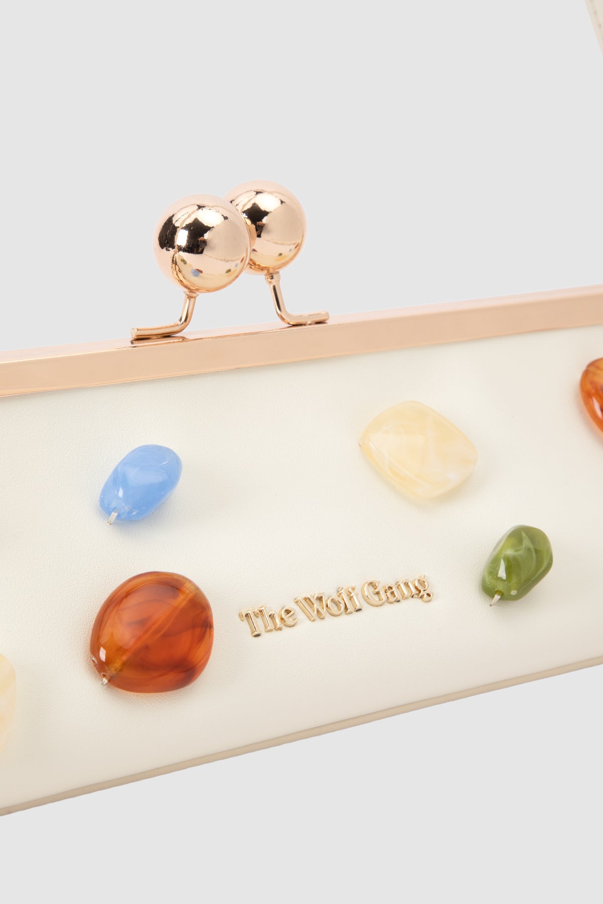 The Kai Shoulder Bag belongs on your shoulder. A petite, sculptural clutch bag, with vintage inspired baguette silhouette, gold clasp hardware, and adorned with abstract resin beads. A piece of wearable art that doubles as a handbag, designed to add a sophisticated, unique focal point to your outfit.