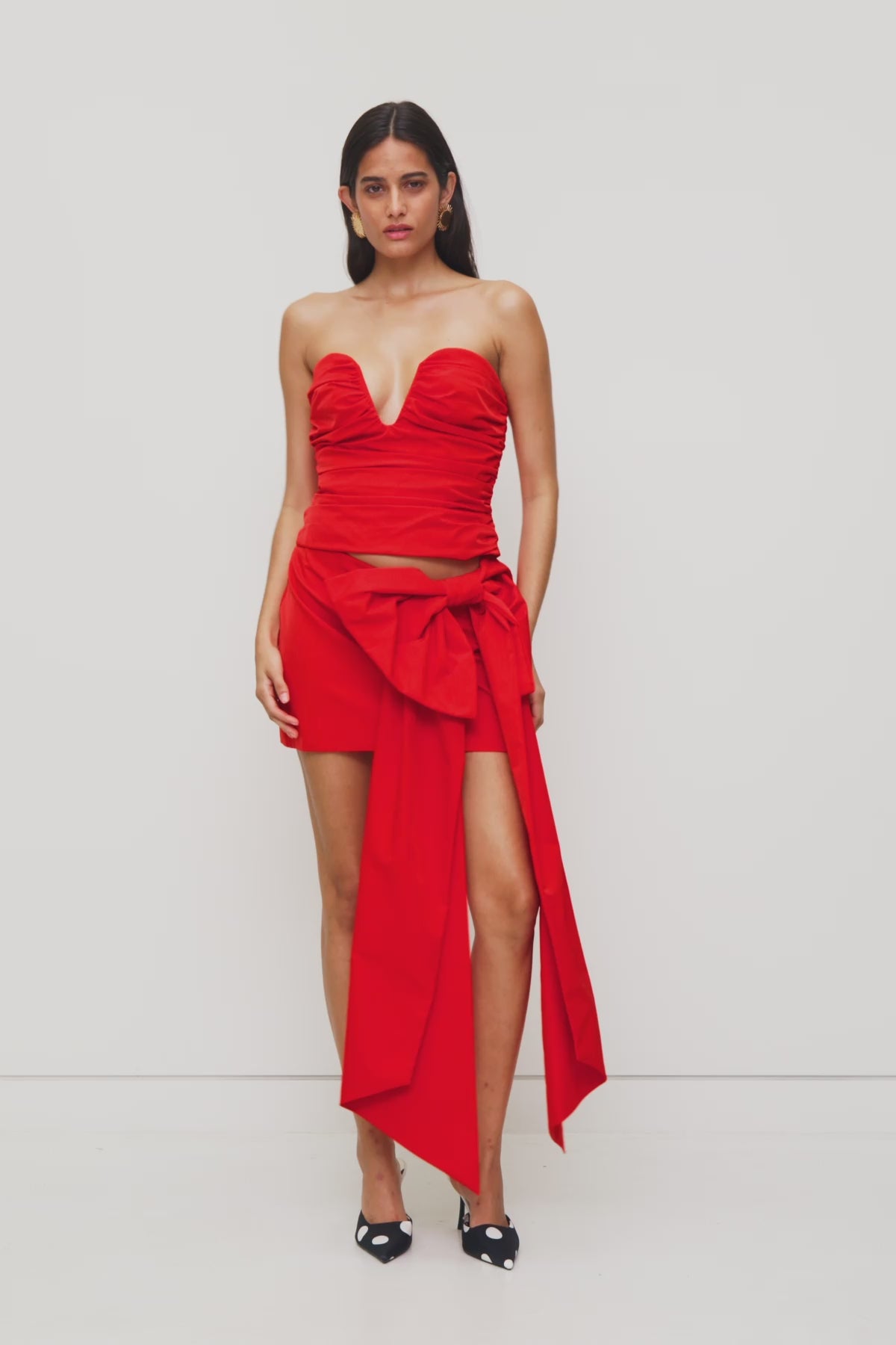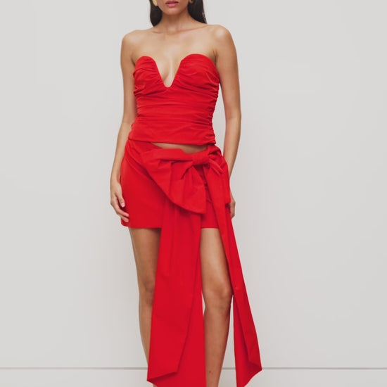 Feminine and flirty, the Luella Skirt is the moment. A mid rise mini in the perfect cherry red, with a statement oversized bow that does the talking for you. Pair back with the matching bustier for polished set dressing that's equal parts runway and resort.