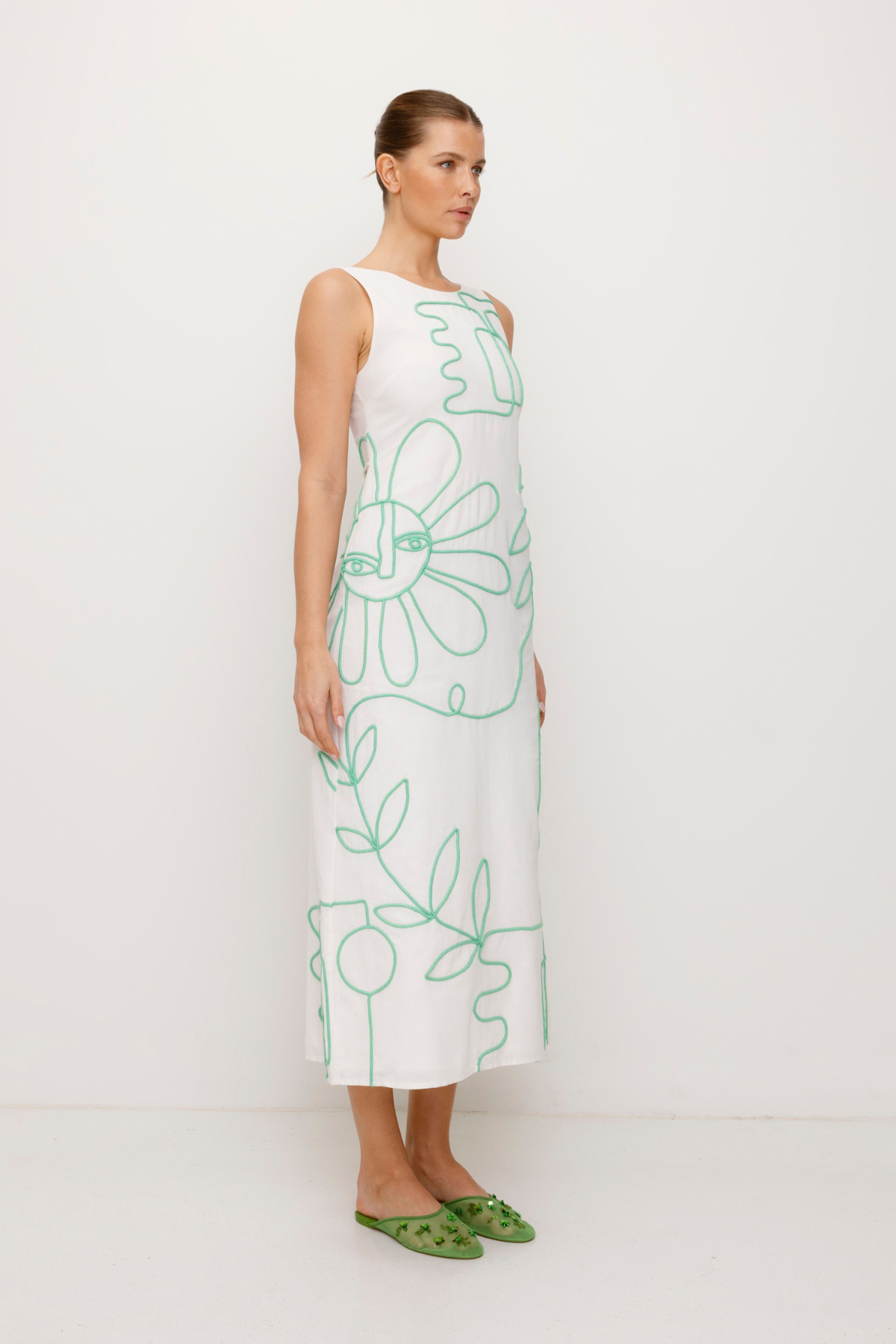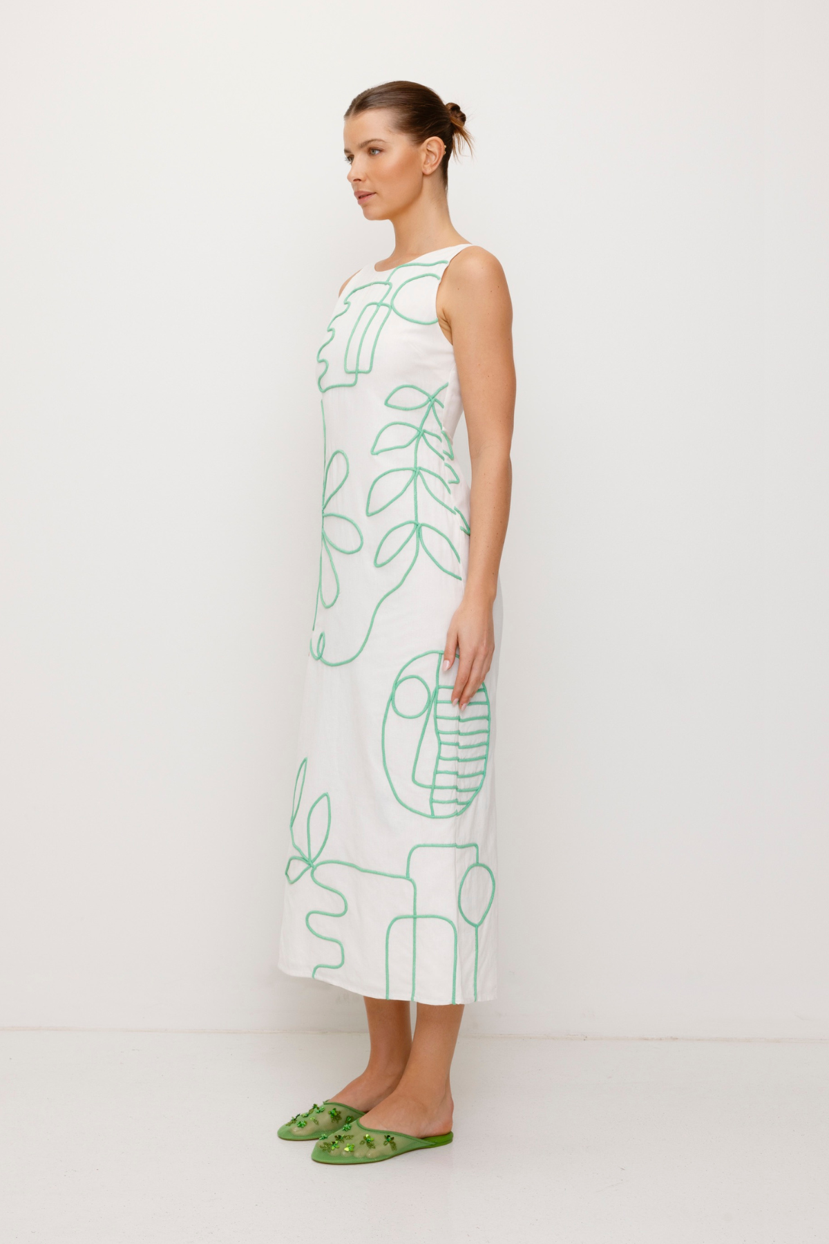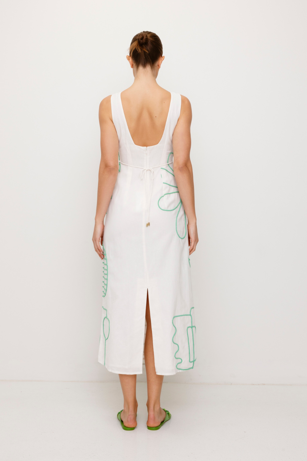 Introducing the Luna Maxi Dress, a vision of effortless elegance. With a soft scoop neckline and custom rope embroidery, lovingly crafted by our artisan makers in India, this dress embodies timeless beauty. The semi-fitted silhouette is complemented by a stunning low back and a delicate tie detail at the waist.