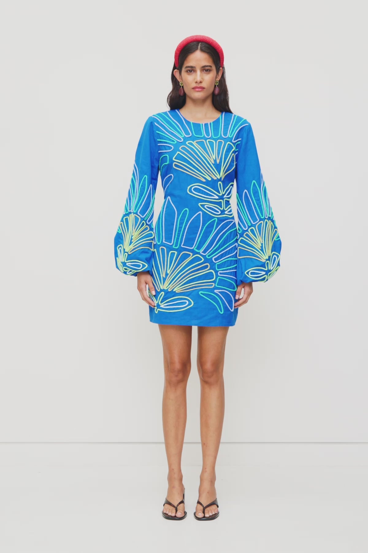 - Long bell sleeve mini dress silhouette