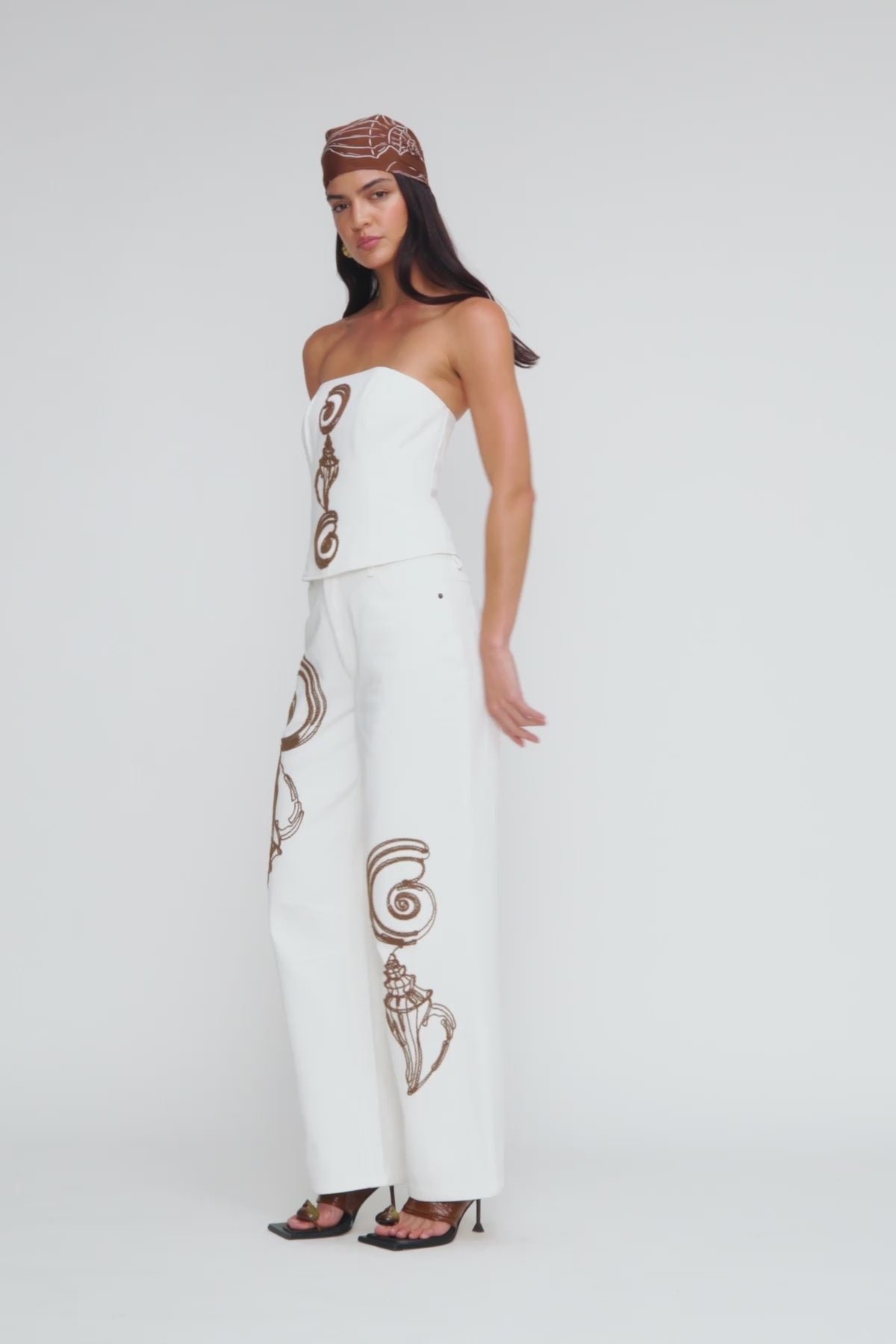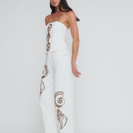 Confident and cool, the Maurie Denim Bustier reimagines street style with a fitted strapless silhouette. Crafted in white denim, it is fully lined with structured boning for support, and detailed hand-drawn shell embroidery that elevates the design. Made to make an impact, Maurie is a versatile statement—style it with its matching jeans for a co-ordinated look, or pair with sleek separates for after-dark edge.