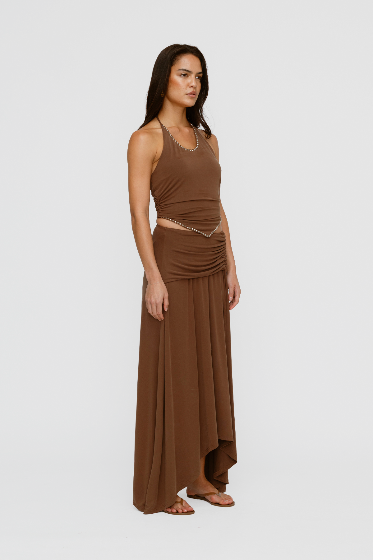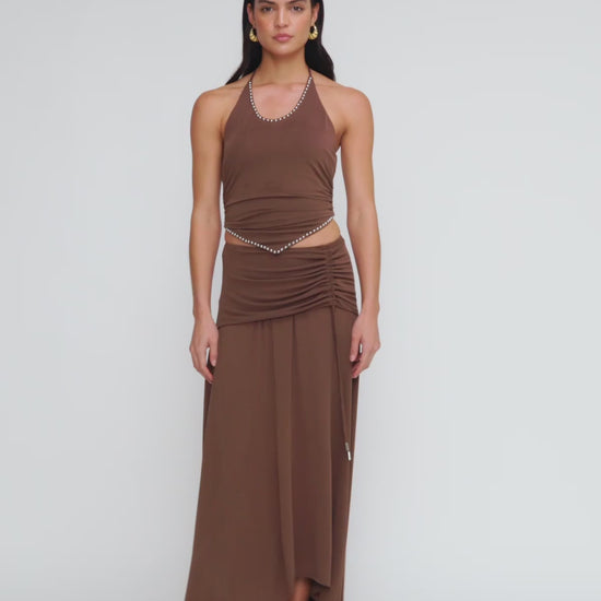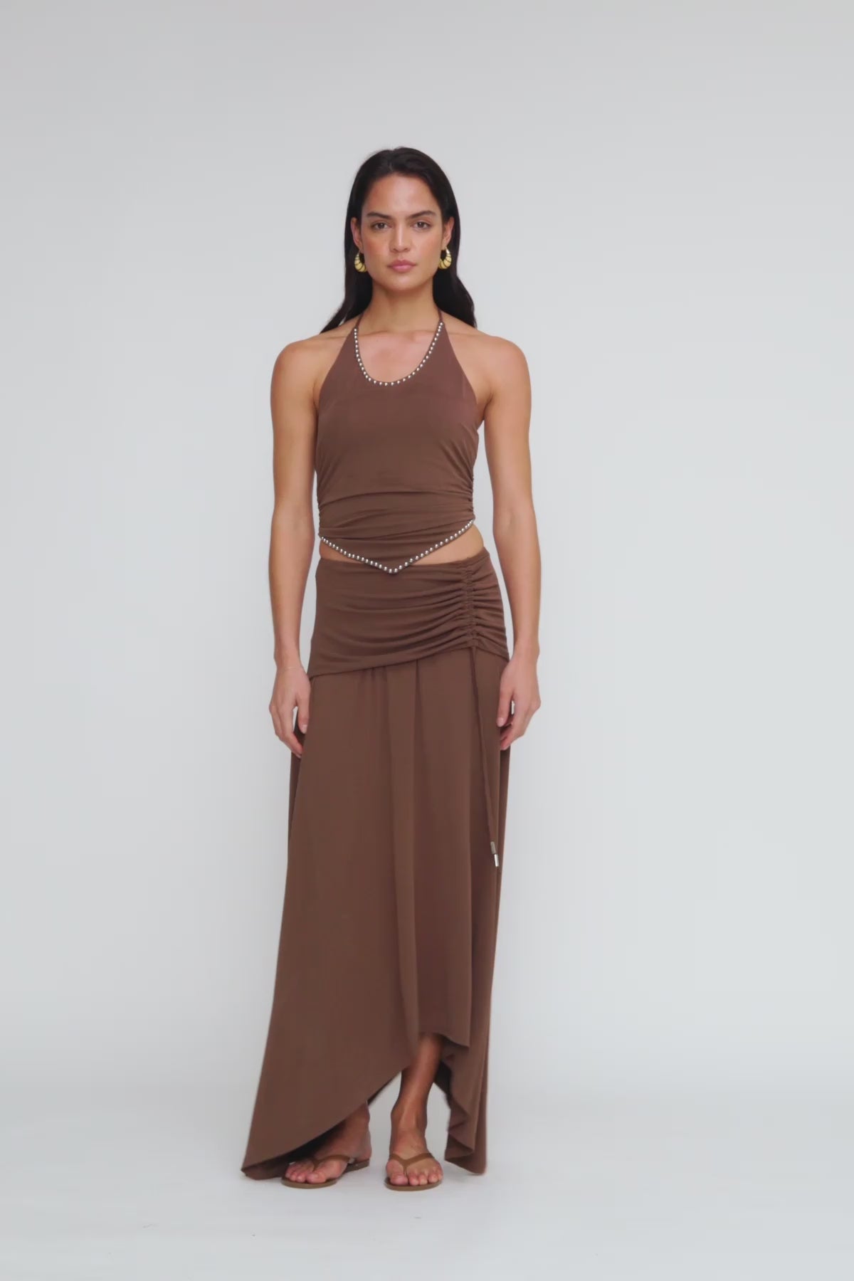 A soft halter top crafted from a buttery stretch cupro fabric, the Piero has a pointed front hem, embellished with silver stud detailing. Pair with the matching skirt for a resort inspired look, that can be worn to warm weather events or layered with a statement coat for a transseasonal street style.