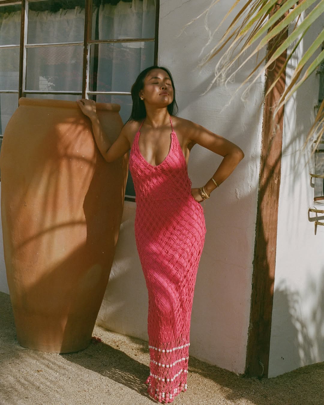 Introducing the Reis Beaded Macrame Maxi Dress: an elegant evolution of our iconic set, now transformed into a stunning dress, perfect for festivals and special occasions. Featuring exquisite handmade macrame weaving with a striking contrast beaded hem for a touch of glamor. The adjustable halter neck tie allows for a customised fit, ensuring you look and feel fabulous.