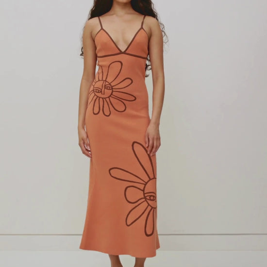 Introducing the Soleil Knit Midi Dress. Crafted from a soft yet form-fitting intarsia knit and adorned with this season's custom flower motif, the Soleil offers both comfort and style. Featuring thin contrasting straps, a low back, and a V-scoop neckline, it’s the perfect blend of chic and ease. Pair it with your favourite stylish flats for the ultimate sunset dinner look.