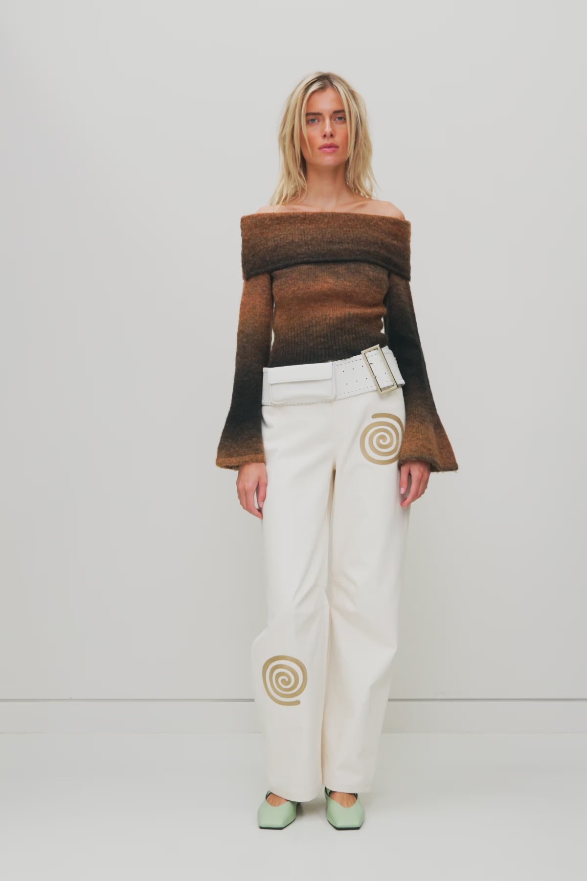 - Off-shoulder silhouette with flared hem on sleeves