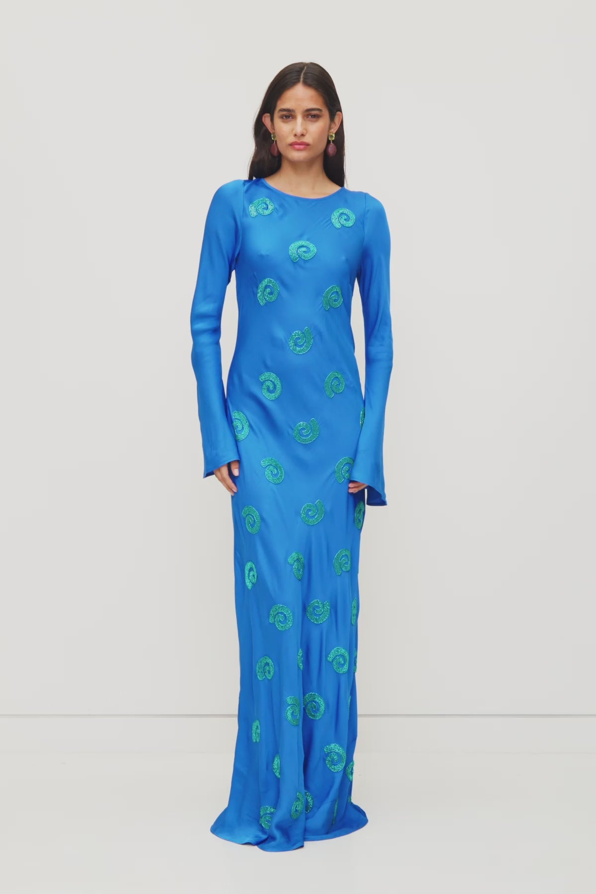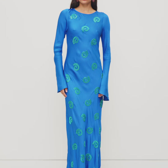 Spiral beaded motifs make the Zephora Maxi Dress shimmer and shine as you move, a special event dress in the most sparkling topaz blue. A bias cut silhouette allows the dress to be easily pulled on over head, while giving a sleek, feminine shape that accents your curves. Designed for late nights and lasting memories.